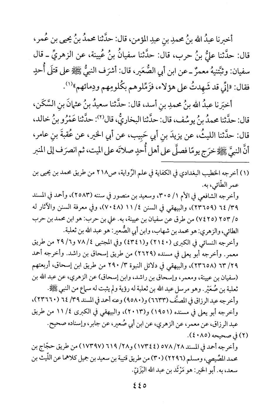 أخبرنا عبدُ اللَّه بنُ محمدِ بنِ عبدِ المؤمن، قال: حدَّثنا محمدُ بنُ يحيى بن عُمر، قال: حدَّثنا عليُّ بنُ حرب، قال: حدَّثنا سفيانُ بنُ عُيينة، عن الزهريِّ -قال سفيان: وثبَّتنيهُ معمرٌ- عن ابن أبي الصُّعَير، قال: أشرَف النبيُّ -صلى اللَّه عليه وسلم- على قتلَى أُحدٍ فقال: "إنِّي قد شَهِدتُ على هؤلاء، فزَمِّلوهم بكُلومِهم ودِمائهم" (¬١).