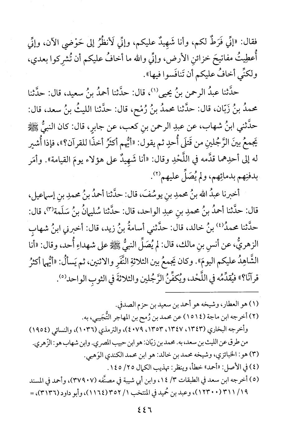 أخبرنا عبدُ اللَّه بنُ محمدِ بنِ يوسُفَ، قال: حدَّثنا أحمدُ بنُ محمدِ بنِ إسماعيل، قال: حدَّثنا أحمدُ بنُ محمدِ بنِ عبدِ الواحد، قال: حدَّثنا سُليمانُ بنُ سَلَمة (¬٣)، قال: حدَّثنا محمدُ (¬٤) بنُ خالد، قال: حدَّثني أسامةُ بنُ زيد، قال: أخبرني ابنُ شهابٍ الزهريُّ، عن أنسِ بنِ مالك، قال: لم يُصَلِّ النبيُّ -صلى اللَّه عليه وسلم- على شهداءِ أُحد، وقال: "أنا الشَّاهِدُ عليكم اليومَ". وكان يَجمعُ بين الثلاثةِ النَّفَرِ والاثنين، ثم يَسألُ: "أيُّهما أكثرُ قرآنًا؟ " فيُقدِّمُه في اللَّحْد، ويُكفِّنُ الرَّجُلين والثلاثةَ في الثوبِ الواحد (¬٥).