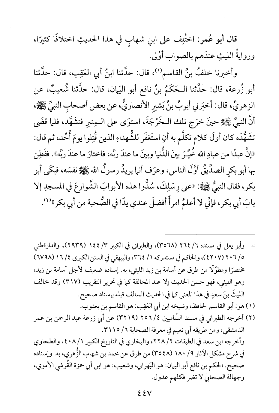 وأخبرنا خلفُ بنُ القاسم (¬١)، قال: حدَّثنا ابنُ أبي العَقِب، قال: حدَّثنا أبو زُرعة، قال: حدَّثنا الحَكَمُ بنُ نافع أبو اليَمان، قال: حدَّثنا شُعيبٌ، عن الزهريِّ، قال: أخبَرني أيوبُ بنُ بَشيرٍ الأنصاريُّ، عن بعض أصحابِ النبيِّ -صلى اللَّه عليه وسلم-، أنَّ النبيَّ -صلى اللَّه عليه وسلم- حينَ خرَج تلك الخَرْجَةَ، استوَى على المِنبرِ فتشَهَّد، فلما قضَى تشَهُّدَه كان أولَ كلام تكلَّم به أنِ استَغفَر للشُّهداءِ الذين قُتِلوا يومَ أُحُد، ثم قال: "إنَّ عبدًا من عبادِ اللَّه خُيِّرَ بينَ الدُّنيا وبينَ ما عندَ ربِّه، فاختارَ ما عندَ ربِّه". ففَطِن بها أبو بكرٍ الصدِّيقُ أوَّلَ الناس، وعرَف أنما يريدُ رسولُ اللَّه -صلى اللَّه عليه وسلم- نفسَه، فبكَى أبو بكر، فقال النبيُّ -صلى اللَّه عليه وسلم-: "على رِسْلِكَ، سُدُّوا هذه الأبوابَ الشَّوارعَ في المسجدِ إلا بابَ أبي بكر، فإنِّي لا أعلمُ امرأً أفضلَ عندي يدًا في الصُّحبة من أبي بكر" (¬٢).