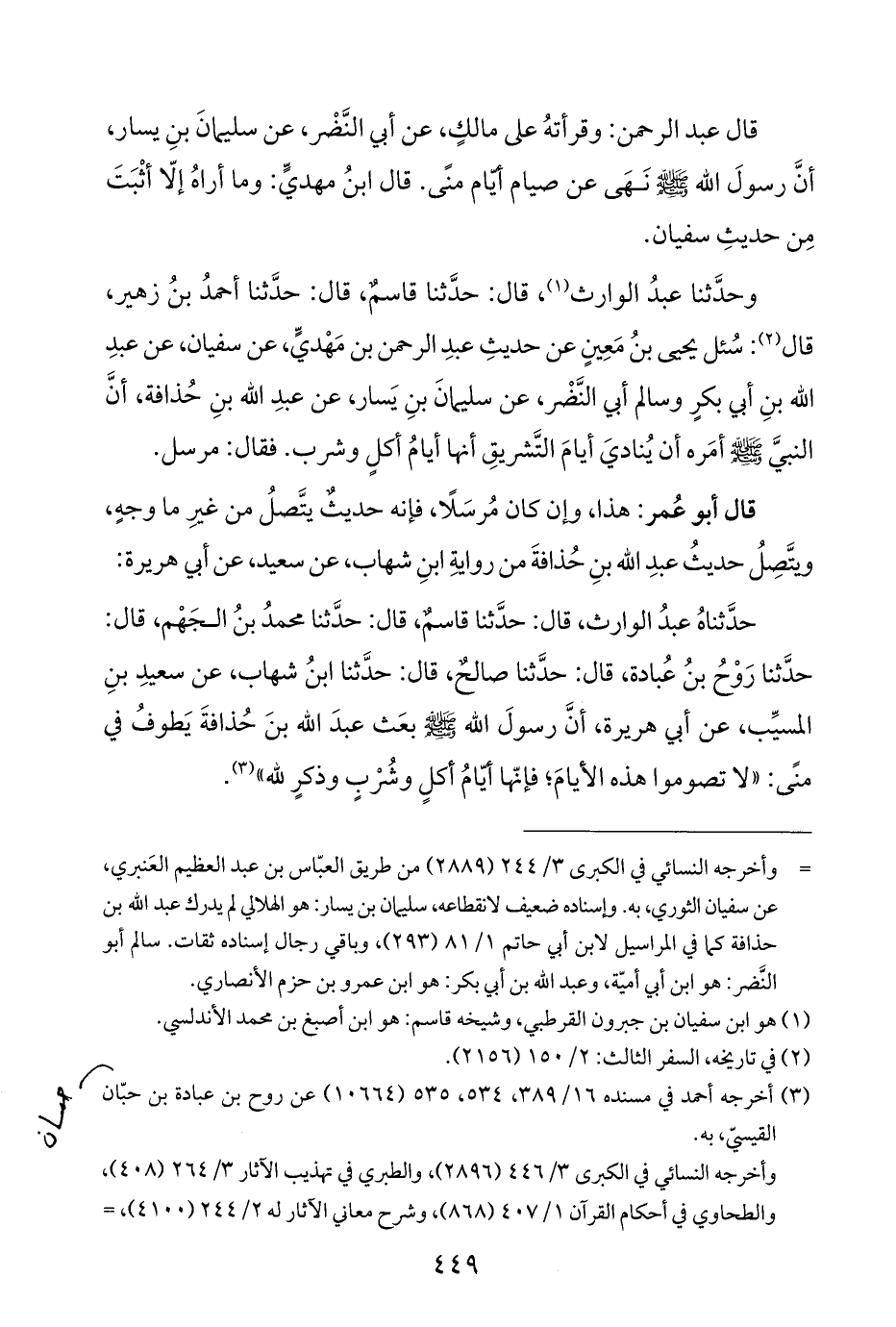 قال عبد الرحمن: وقرأتهُ على مالكٍ، عن أبي النَّضْر، عن سليمانَ بنِ يسار، أنَّ رسولَ اللَّه -صلى اللَّه عليه وسلم- نَهَى عن صيام أيّام منًى. قال ابنُ مهديٍّ: وما أراهُ إلّا أثْبَتَ مِن حديثِ سفيان.