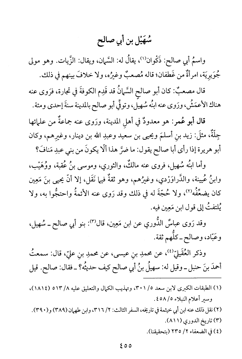 وأما ابنُه سُهيل، فروى عنه مالكٌ، والثوري، وموسى بنُ عُقبة، ووُهَيْب، وابنُ عُيينة، والدَّراوَرْدي، وغيرُهم، وهو ثقةٌ فيما نَقَل، إلا أنّ يحيى بنَ مَعِين كان يضعِّفُه (¬٢)، ولا حُجّةَ له في ذلك وقد رَوى عنه الأئمةُ واحتجُّوا به، ولا يُلتفتُ إلى قول ابن مَعِين فيه.