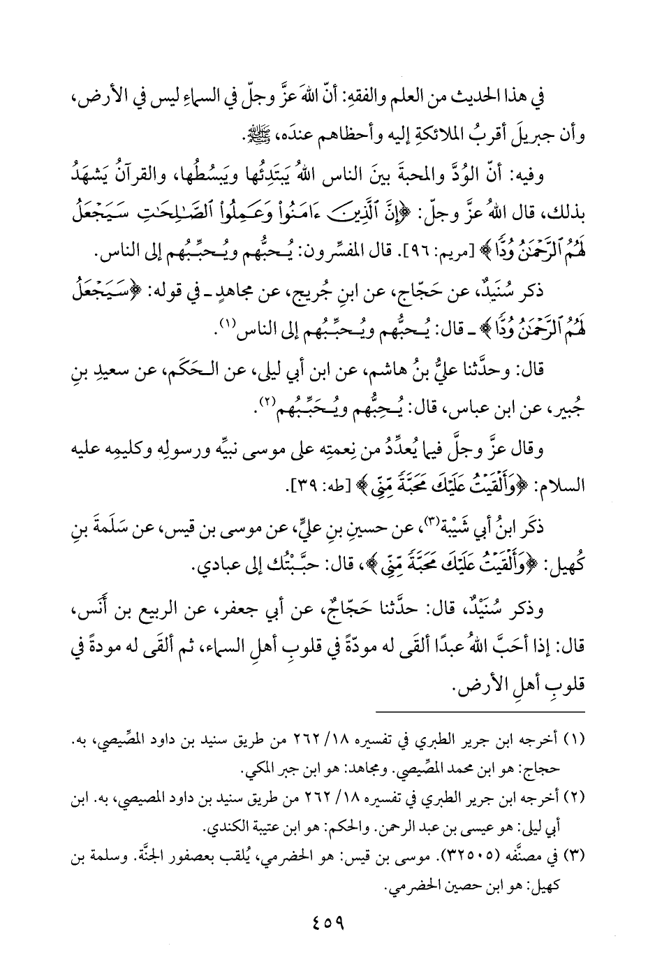 وذكر سُنَيْدٌ، قال: حدَّثنا حَجّاجٌ، عن أبي جعفر، عن الربيع بن أَنَس، قال: إذا أحَبَّ اللَّهُ عبدًا ألقَى له مودّةً في قلوبِ أهلِ السماء، ثم ألقَى له مودةً في قلوبِ أهلِ الأرض.