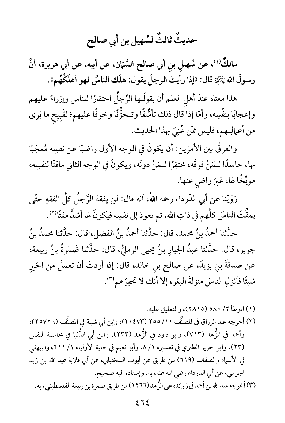 مالكٌ (¬١)، عن سُهيلِ بنِ أبي صالح السَّمّان، عن أبيه، عن أبي هريرة، أنَّ رسولَ اللَّه -صلى اللَّه عليه وسلم- قال: "إذا رأيتَ الرجلَ يقول: هلَك الناسُ فهو أهلكُهُم".