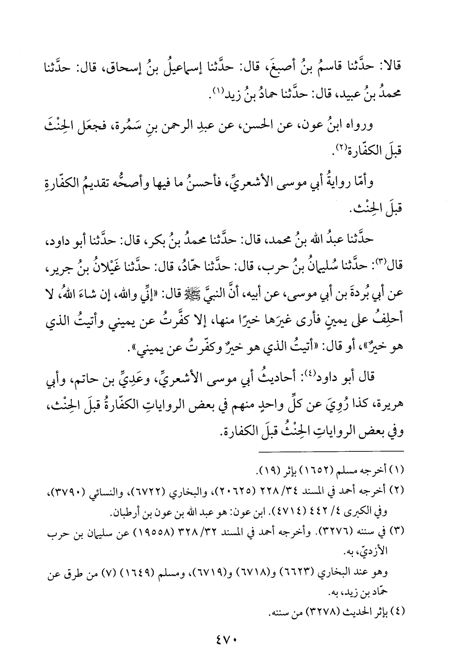 قال أبو داود (¬٤): أحاديثُ أبي موسى الأشعريِّ، وعَدِيِّ بن حاتم، وأبي هريرة، كذا رُوِيَ عن كلِّ واحدٍ منهم في بعض الرواياتِ الكفّارةُ قبلَ الحِنْث، وفي بعض الرواياتِ الحِنْثُ قبلَ الكفارة.