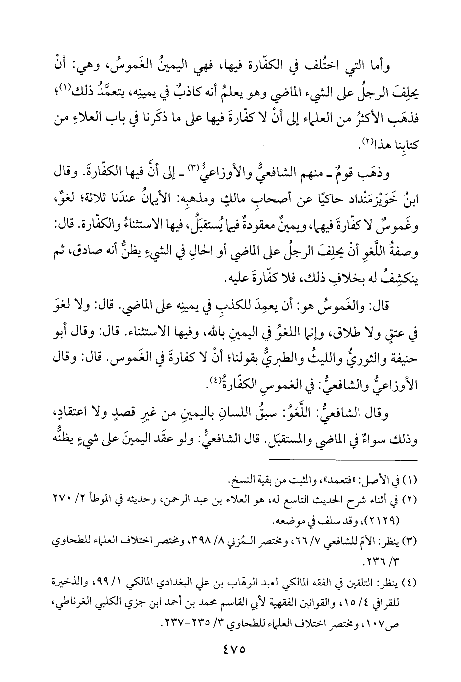 قال: والغَموسُ هو: أن يعمِدَ للكذبِ في يمينِه على الماضي. قال: ولا لغوَ في عتقٍ ولا طلاق، وإنما اللغوُ في اليمينِ باللَّه، وفيها الاستثناء. قال: وقال أبو حنيفة والثوريُّ والليثُ والطبريُّ بقولنا؛ أنْ لا كفارةَ في الغَموس. قال: وقال الأوزاعيُّ والشافعيُّ: في الغموسِ الكفّارةُ (¬٤).