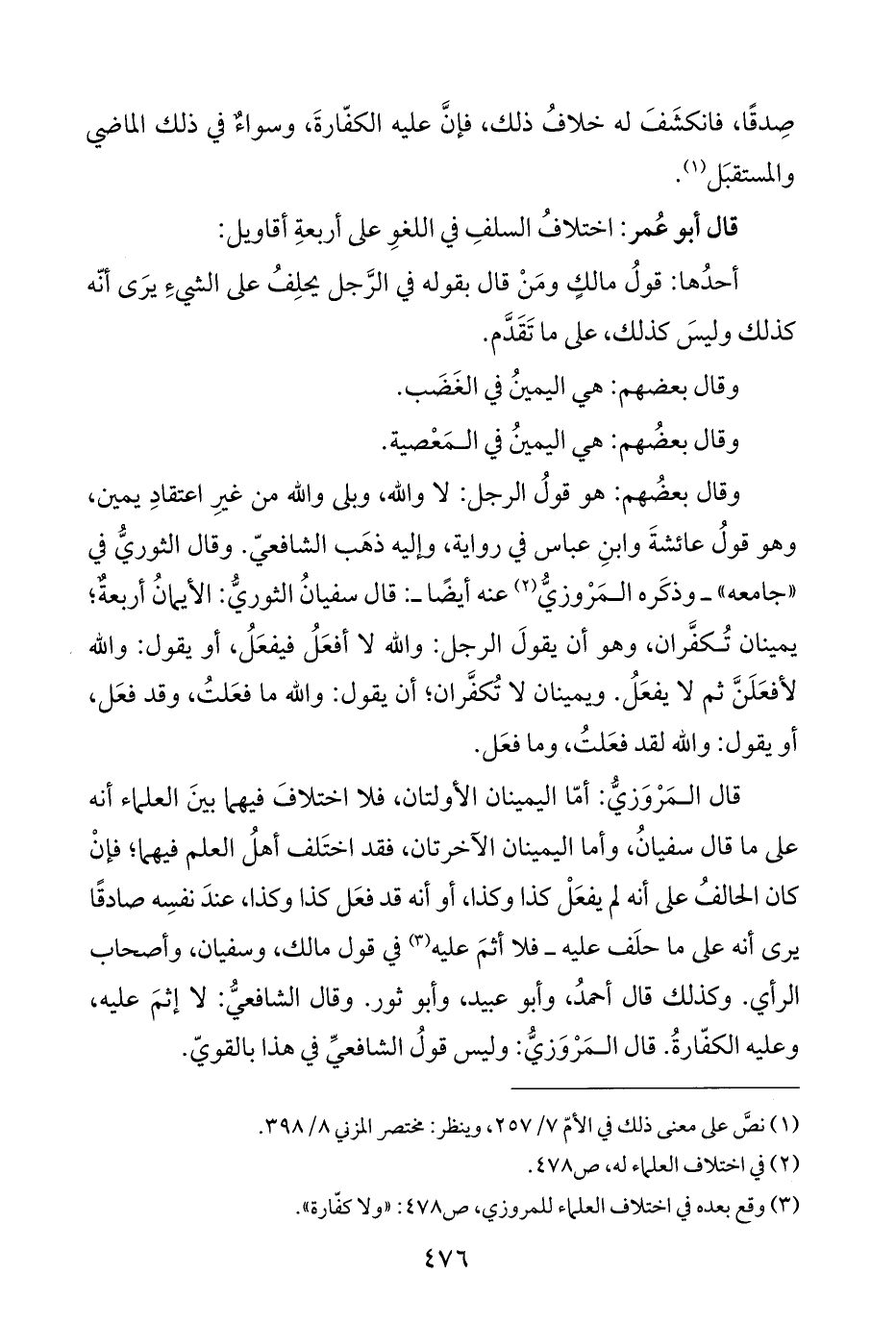 قال المَرْوَزيُّ: أمّا اليمينان الأولتان، فلا اختلافَ فيهما بينَ العلماء أنه على ما قال سفيانُ، وأما اليمينان الآخرتان، فقد اختَلف أهلُ العلم فيهما؛ فإنْ كان الحالفُ على أنه لم يفعَلْ كذا وكذا، أو أنه قد فعَل كذا وكذا، عندَ نفسِه صادقًا يرى أنه على ما حلَف عليه -فلا أثمَ عليه (¬٣) في قول مالك، وسفيان، وأصحاب الرأي. وكذلك قال أحمدُ، وأبو عبيد، وأبو ثور. وقال الشافعيُّ: لا إثمَ عليه، وعليه الكفّارةُ. قال المَرْوَزيُّ: وليس قولُ الشافعيِّ في هذا بالقويّ.