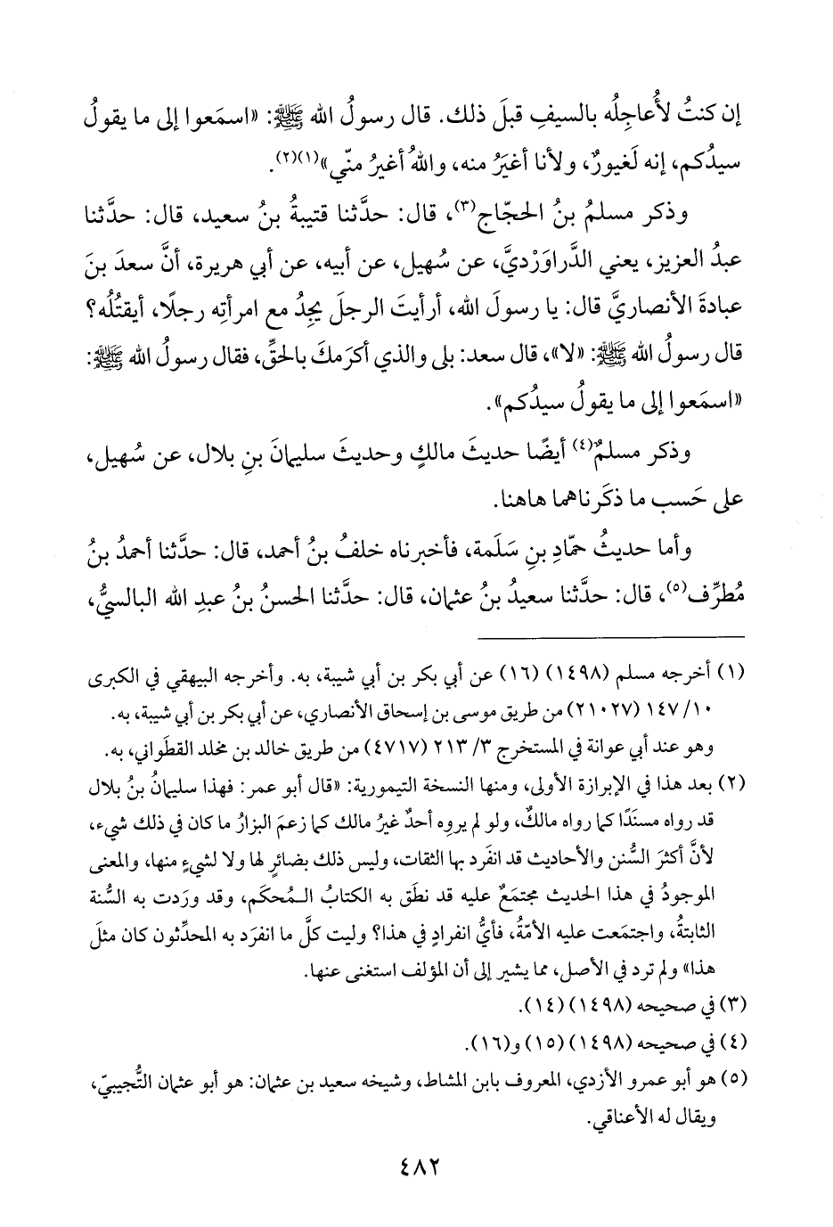 وذكر مسلمُ بنُ الحجّاج (¬٣)، قال: حدَّثنا قتيبةُ بنُ سعيد، قال: حدَّثنا عبدُ العزيز، يعني الدَّراوَرْديَّ، عن لمُمهيل، عن أبيه، عن أبي هريرة، أنَّ سعدَ بنَ عبادةَ الأنصاريَّ قال: يا رسولَ اللَّه، أرأيتَ الرجلَ يجِدُ مع امرأتِه رجلًا، أيقتُلُه؟ قال رسولُ اللَّه -صلى اللَّه عليه وسلم-: "لا"، قال سعد: بلى والذي أكرَمكَ بالحقِّ، فقال رسولُ اللَّه -صلى اللَّه عليه وسلم-: "اسمَعوا إلى ما يقولُ سيدُكم".
