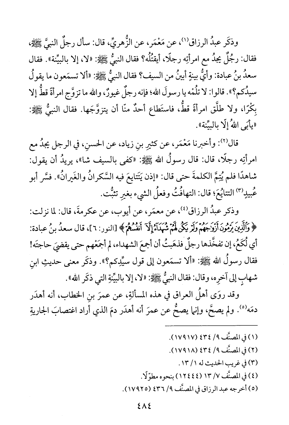 وذكَر عبدُ الرزاق (¬١)، عن مَعْمَر، عن الزُّهريِّ، قال: سأل رجلٌ النبيَّ -صلى اللَّه عليه وسلم-، فقال: رجُلٌ يجدُ مع امرأتِه رجلًا، أيقتُلُه؟ فقال النبيُّ -صلى اللَّه عليه وسلم-: "لا، إلا بالبيِّنة". فقال سعدُ بنُ عبادة: وأيُّ بينةٍ أبينُ من السيف؟ فقال النبيُّ -صلى اللَّه عليه وسلم-: "ألا تسمَعون ما يقولُ سيدُكم؟ ". قالوا: لا تلُمْه يا رسولَ اللَّه؛ فإنه رجلٌ غيورٌ، واللَّه ما تزوَّج امرأةً قطُّ إلا بِكْرًا، ولا طلَّق امرأةً قطُّ، فاستَطاع أحدٌ منّا أن يتزوَّجَها. فقال النبيُّ -صلى اللَّه عليه وسلم-: "يأبَى اللَّهُ إلّا بالبيِّنة".