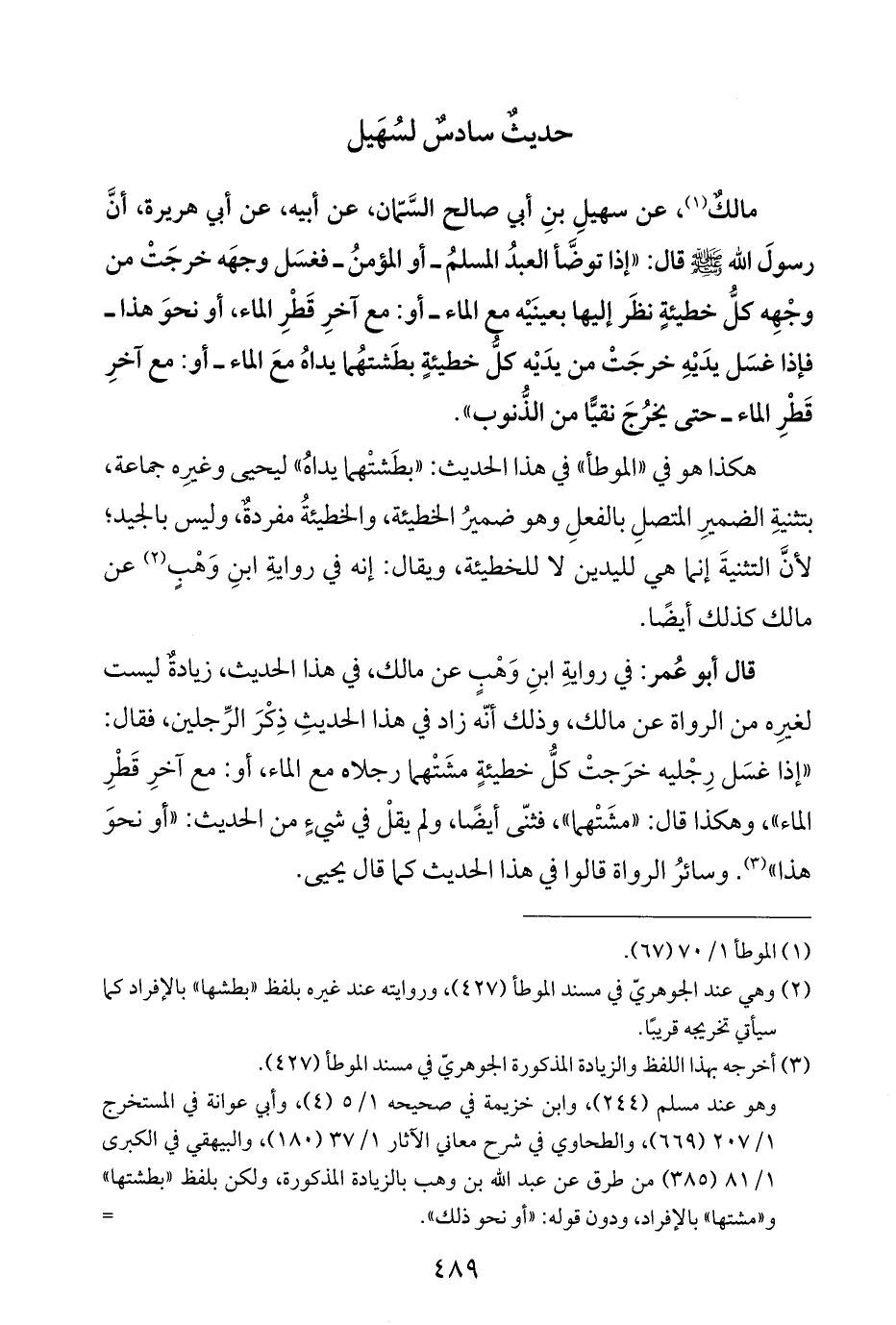 قال أبو عُمر: في روايةِ ابنِ وَهْبٍ عن مالك، في هذا الحديث، زيادةٌ ليست لغيرِه من الرواة عن مالك، وذلك أنّه زاد في هذا الحديثِ ذِكْرَ الرِّجلين، فقال: "إذا غسَل رِجْليه خرَجتْ كلُّ خطيئةٍ مشَتْهما رجلاه مع الماء، أو: مع آخرِ قَطْرِ الماء"، وهكذا قال: "مشَتْهما"، فثنّى أيضًا، ولم يقلْ في شيءٍ من الحديث: "أو نحوَ هذا" (¬٣). وسائرُ الرواة قالوا في هذا الحديث كما قال يحيى.