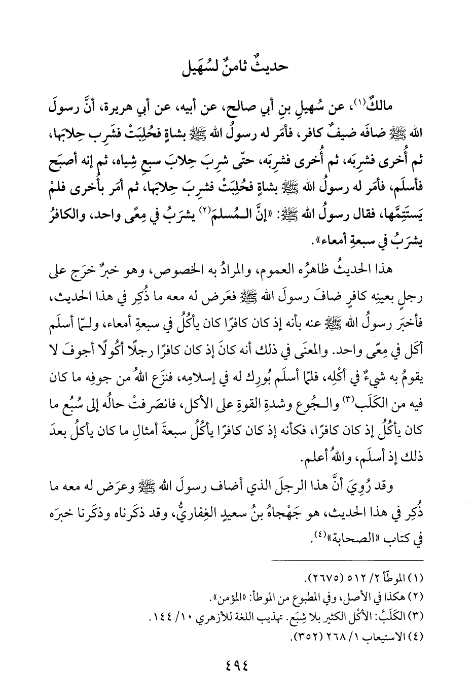 مالكٌ (¬١)، عن سُهيلِ بنِ أبي صالح، عن أبيه، عن أبي هريرة، أنَّ رسولَ اللَّه -صلى اللَّه عليه وسلم- ضافَه ضيفٌ كافر، فأمَر له رسولُ اللَّه -صلى اللَّه عليه وسلم- بشاةٍ فحُلِبَتْ فشَرِب حِلابَها، ثم أُخرى فشرِبَه، ثم أُخرى فشرِبَه، حتّى شرِبَ حِلابَ سبعِ شِياه، ثم إنه أصبَح فأسلَم، فأمَر له رسولُ اللَّه -صلى اللَّه عليه وسلم- بشاةٍ فحُلِبَتْ فشرِبَ حِلابَها، ثم أمَر بأُخرى فلمْ يَستَتِمَّها، فقال رسولُ اللَّه -صلى اللَّه عليه وسلم-: "إنَّ المُسلمَ (¬٢) يشرَبُ في مِعًى واحد، والكافرُ يشرَبُ في سبعةِ أمعاء".