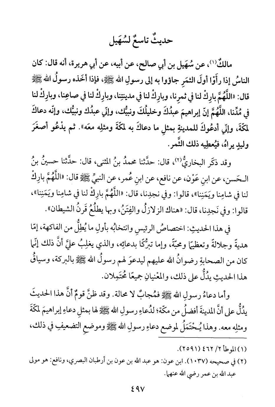 مالكٌ (¬١)، عن سُهَيل بن أبي صالح، عن أبيه، عن أبي هريرة، أنه قال: كان الناسُ إذا رأَوْا أولَ الثمَرِ جاؤوا به إلى رسولِ اللَّه -صلى اللَّه عليه وسلم-، فإذا أخَذه رسولُ اللَّه -صلى اللَّه عليه وسلم- قال: "اللَّهُمَّ بارِكْ لنا في ثمرِنا، وبارِكْ لنا في مدينتِنا، وبارِكْ لنا في صاعِنا، وبارِكْ لنا في مُدِّنا، اللَّهُمَّ إنّ إبراهيمَ عبدُكَ وخليلُكَ ونبيُّك، وإنّي عبدُك ونبيّك، وإنّه دعاكَ لمكّةَ، وإنّي أدعُوكَ للمدينةِ بمثلِ ما دعاكَ به لمكّةَ ومثلِه معَه". ثم يدْعُو أصغَرَ وليدٍ يراهُ، فيُعطِيه ذلك الثَّمر.