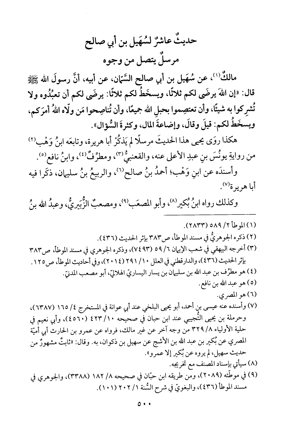 مالكٌ (¬١)، عن سُهَيل بن أبي صالح السَّمّان، عن أبيه، أنَّ رسولَ اللَّه -صلى اللَّه عليه وسلم- قال: "إن اللَّهَ يرضَى لكم ثلاثًا، ويسخَطُ لكم ثلاثًا: يرضَى لكم أن تعبُدُوه ولا تُشرِكوا به شيئًا، وأن تعتصِموا بحبلِ اللَّه جميعًا، وأن تُناصِحوا مَن ولّاه اللَّهُ أمرَكم، ويسخَطُ لكم: قيلَ وقالَ، وإضاعةَ المال، وكثرةَ السُّؤال".