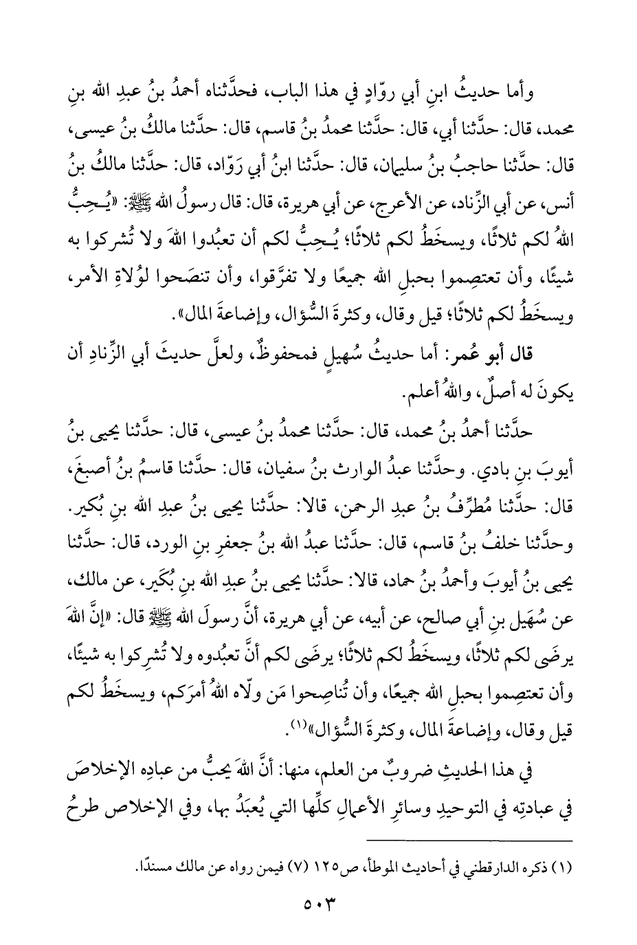 حدَّثنا أحمدُ بنُ محمد، قال: حدَّثنا محمدُ بنُ عيسى، قال: حدَّثنا يحيى بنُ أيوبَ بنِ بادي. وحدَّثنا عبدُ الوارث بنُ سفيان، قال: حدَّثنا قاسمُ بنُ أصبغَ، قال: حدَّثنا مُطرِّفُ بنُ عبدِ الرحمن، قالا: حدَّثنا يحيى بنُ عبدِ اللَّه بنِ بُكير. وحدَّثنا خلفُ بنُ قاسم، قال: حدَّثنا عبدُ اللَّه بنُ جعفرِ بنِ الورد، قال: حدَّثنا يحيى بنُ أيوبَ وأحمدُ بنُ حماد، قالا: حدَّثنا يحيى بنُ عبدِ اللَّه بنِ بُكَير، عن مالك، عن سُهَيل بنِ أبي صالح، عن أبيه، عن أبي هريرة، أنَّ رسولَ اللَّه -صلى اللَّه عليه وسلم- قال: "إنَّ اللَّهَ يرضَى لكم ثلاثًا، ويسخَطُ لكم ثلاثًا؛ يرضَى لكم أنَّ تعبُدوه ولا تُشرِكوا به شيئًا، وأن تعتصِموا بحبلِ اللَّه جميعًا، وأن تُناصِحوا مَن ولّاه اللَّهُ أمرَكم، ويسخَطُ لكم قيل وقال، وإضاعةَ المال، وكثرةَ السُّؤال" (¬١).