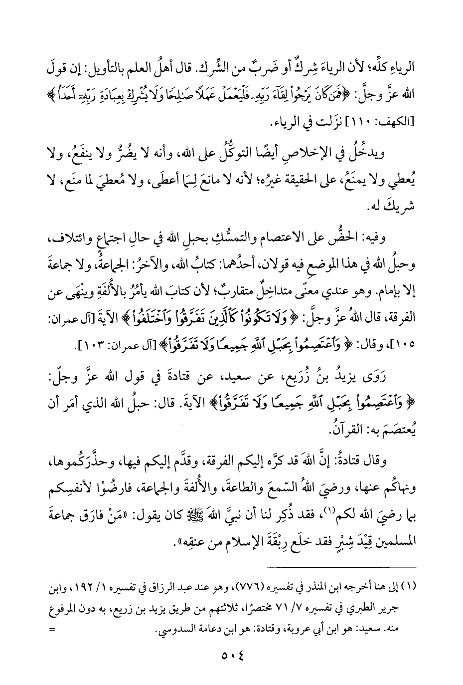 رَوَى يزيدُ بنُ زُرَيع، عن سعيد، عن قتادةَ في قول اللَّه عزَّ وجلَّ: {وَاعْتَصِمُوا بِحَبْلِ اللَّهِ جَمِيعًا وَلَا تَفَرَّقُوا} الآيةَ. قال: حبلُ اللَّه الذي أمَر أن يُعتصَمَ به: القرآنُ.