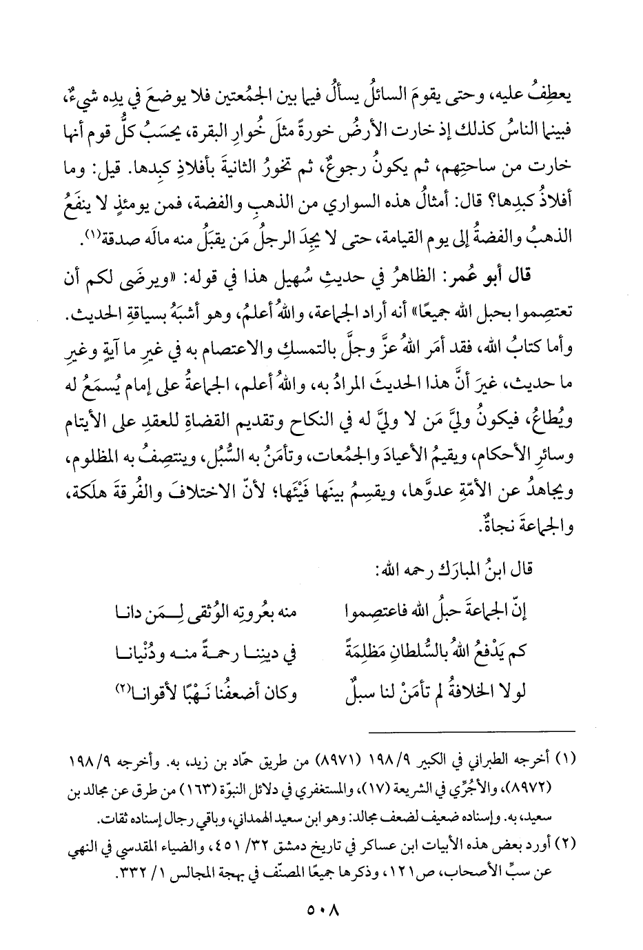 قال أبو عُمر: الظاهرُ في حديثِ سهيل هذا في قوله: "ويرضَى لكم أن تعتصِموا بحبل اللَّه جميعًا" أنه أراد الجماعة، واللَّهُ أعلمُ، وهو أشبَهُ بسياقةِ الحديث. وأما كتابُ اللَّه، فقد أمَر اللَّهُ عزَّ وجلَّ بالتمسكِ والاعتصام به في غيرِ ما آيةٍ وغيرِ ما حديث، غيرَ أنَّ هذا الحديثَ المرادُ به، واللَّهُ أعلم، الجماعةُ على إمام يُسمَعُ له ويُطاعُ، فيكونُ وليَّ مَن لا وليَّ له في النكاح وتقديم القضاةِ للعقدِ على الأيتام وسائرِ الأحكام، ويقيمُ الأعيادَ والجمُعات، وتأمَنُ به السُّبُل، وينتصِفُ به المظلوم، ويجاهدُ عن الأمّةِ عدوَّها، ويقسِمُ بينَها فَيْئَها؛ لأنّ الاختلافَ والفُرقةَ هلَكة، والجماعةَ نجاةٌ.