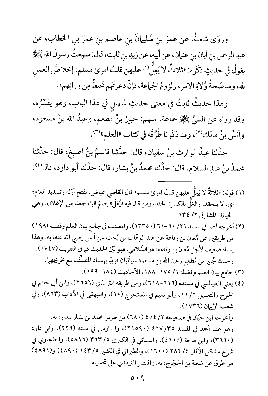 وروَى شعبةُ، عن عمرَ بنِ سُليمانَ بنِ عاصم بنِ عمرَ بنِ الخطاب، عن عبدِ الرحمن بنِ أبانِ بنِ عثمان، عن أبيه، عن زيدِ بنِ ثابت، قال: سمِعتُ رسولَ اللَّه -صلى اللَّه عليه وسلم- يقولُ في حديثٍ ذكَره: "ثلاثٌ لا يَغِلُّ (¬١) عليهن قلبُ امرئ مسلم: إخلاصُ العملِ للَّه، ومناصَحةُ وُلاةِ الأمر، ولزومُ الجماعة، فإنّ دعوتَهم تحيطُ مِن ورائِهم".
