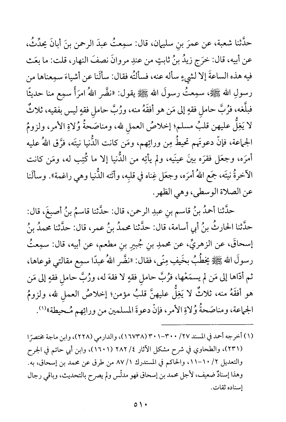 حدَّثنا أحمدُ بنُ قاسم بنِ عبدِ الرحمن، قال: حدَّثنا قاسمُ بنُ أصبغَ، قال: حدَّثنا الحارثُ بنُ أبي أسامة، قال: حدَّثنا محمدُ بنُ عمر، قال: حدَّثنا محمدُ بنُ إسحاقَ، عن الزهريِّ، عن محمدِ بنِ جُبيرِ بنِ مطعم، عن أبيه، قال: سمِعتُ رسولَ اللَّه -صلى اللَّه عليه وسلم- يخطُبُ بخَيفِ مِنًى، فقال: "نضَّر اللَّهُ عبدًا سمِع مقالتي فوعاها، ثم أدّاها إلى مَن لم يسمَعْها، فرُبَّ حاملِ فقهٍ لا فقهَ له، ورُبَّ حاملِ فقهٍ إلى مَن هو أفقَهُ منه، ثلاثٌ لا يَغِلُّ عليهنَّ قلبُ مؤمن؛ إخلاصُ العملِ للَّه، ولزومُ الجماعة، ومناصَحةُ وُلاةِ الأمر، فإنّ دعوةَ المسلمين من ورائِهم مُحيطة" (¬١).