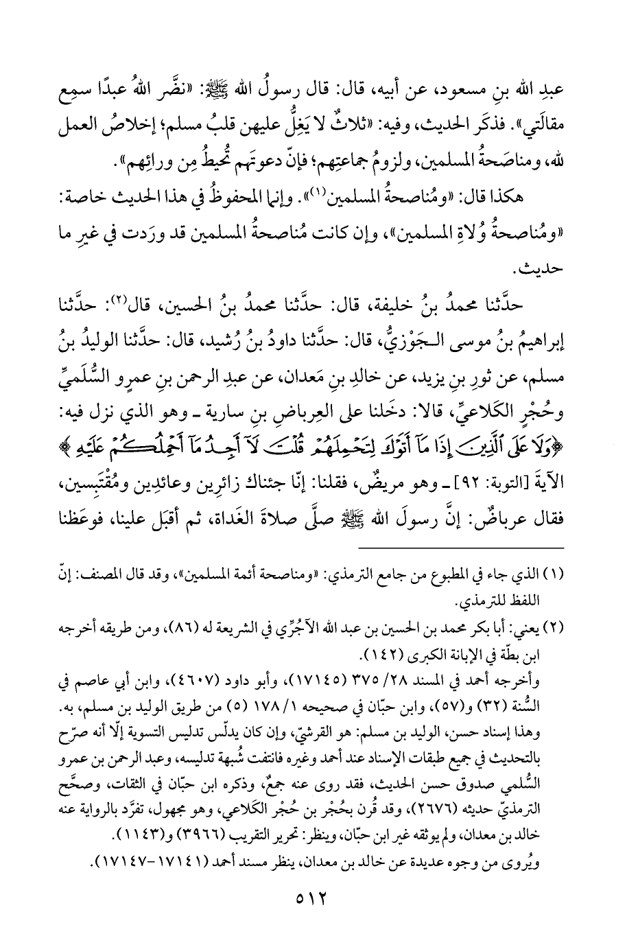 حدَّثنا محمدُ بنُ خليفة، قال: حدَّثنا محمدُ بنُ الحسين، قال (¬٢): حدَّثنا إبراهيمُ بنُ موسى الجَوْزيُّ، قال: حدَّثنا داودُ بنُ رُشيد، قال: حدَّثنا الوليدُ بنُ مسلم، عن ثورِ بنِ يزيد، عن خالدِ بنِ مَعدان، عن عبدِ الرحمن بنِ عمرٍو السُّلَميِّ وحُجْرٍ الكَلاعيِّ، قالا: دخَلنا على العِرباضِ بنِ سارية -وهو الذي نزل فيه: {وَلَا عَلَى الَّذِينَ إِذَا مَا أَتَوْكَ لِتَحْمِلَهُمْ قُلْتَ لَا أَجِدُ مَا أَحْمِلُكُمْ عَلَيْهِ} الآيةَ [التوبة: ٩٢]- وهو مريضٌ، فقلنا: إنّا جئناك زائرِين وعائدِين ومُقْتَبِسين، فقال عرباضٌ: إنَّ رسولَ اللَّه -صلى اللَّه عليه وسلم- صلَّى صلاةَ الغَداة، ثم أقبَل علينا، فوعَظنا