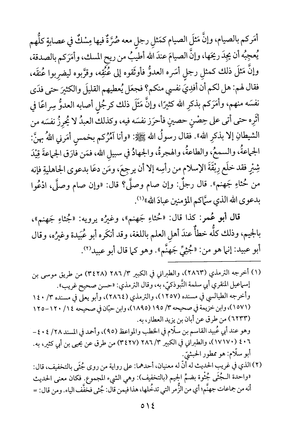 أمَركم بالصيام، وإنَّ مَثلَ الصيام كمَثلِ رجلٍ معه صُرَّةٌ فيها مِسْكٌ في عصابةٍ كلُّهم يُعجِبُه أن يجِدَ ريحَها، وإنَّ الصيامَ عندَ اللَّه أطيبُ من ريحِ المسك، وأمَرَكم بالصدقة، وإنَّ مَثلَ ذلك كمثلِ رجلٍ أسَره العدوُّ فأوثَقوه إلى عُنُقِه، وقرَّبوه ليضرِبوا عُنقَه، فقال لهم: هل لكم أن أفدِيَ نفسي منكم؟ فجعَل يُعطيهم القليلَ والكثيرَ حتى فدَى نفسَه منهم، وأمَرَكم بذكرِ اللَّه كثيرًا، وإنَّ مَثَلَ ذلك كرجُلٍ أصابه العدوُّ سِراعًا في أثَرِه حتى أتى على حِصْنٍ حصينٍ فأحرَز نفسَه فيه، وكذلك العبدُ لا يُحرِزُ نفسَه من الشيطانِ إلا بذكرِ اللَّه". فقال رسولُ اللَّه -صلى اللَّه عليه وسلم-: "وأنا آمُرُكم بخمسٍ أمَرني اللَّهُ بهنَّ: الجماعةُ، والسمعُ، والطاعةُ، والهجرةُ، والجهادُ في سبيلِ اللَّه، فمَن فارَق الجماعةَ قِيْدَ شِبْرٍ فقد خلَع رِبْقَةَ الإسلام من رأسِه إلا أن يرجِعَ، ومَن دعَا بدعوى الجاهليةِ فإنه من حُثاءِ جَهنم". قال رجلٌ: وإن صام وصلَّى؟ قال: "وإن صام وصلَّى، ادْعُوا بدعوى اللَّه الذي سمَّاكم المؤمنين عبادَ اللَّه" (¬١).