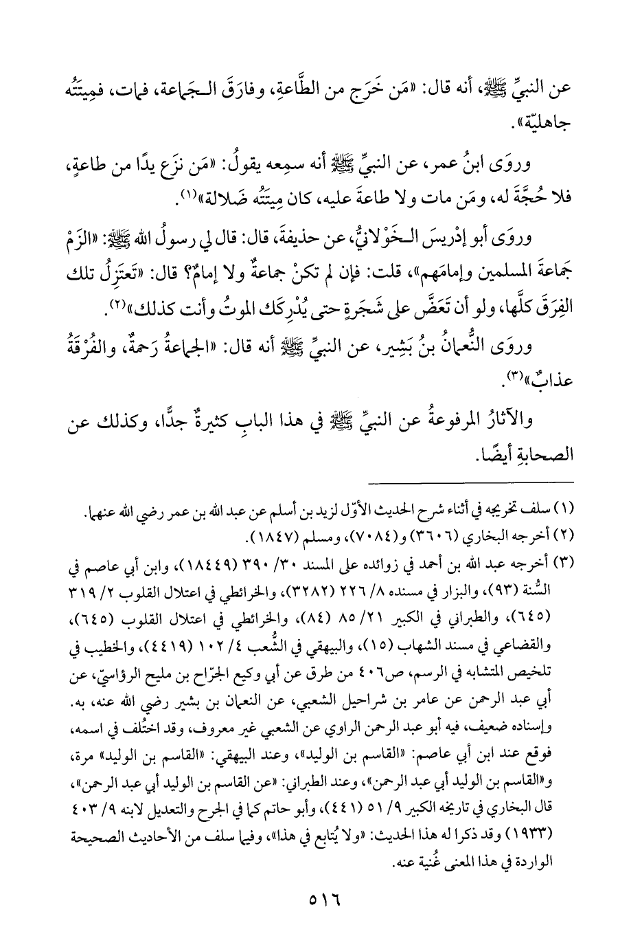 وروَى النُّعمانُ بنُ بَشِير، عن النبيِّ -صلى اللَّه عليه وسلم- أنه قال: "الجماعةُ رَحمةٌ، والفُرْقَةُ عذابٌ" (¬٣).