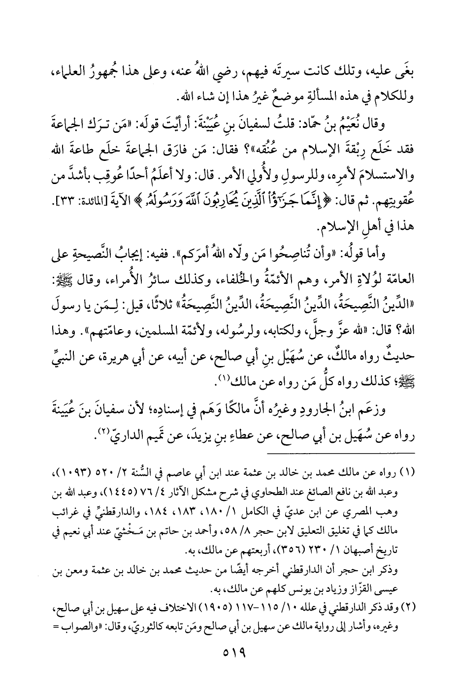وقال نُعَيْمُ بنُ حمّاد: قلتُ لسفيانَ بنِ عُيَيْنةَ: أرأيْتَ قولَه: "مَن ترَك الجماعةَ فقد خَلَع رِبْقةَ الإسلام من عُنُقه"؟ فقال: مَن فارَق الجماعةَ خلَع طاعةَ اللَّه والاستسلامَ لأمرِه، وللرسولِ ولأُولي الأمر. قال: ولا أعلَمُ أحدًا عُوقِب بأشدَّ من عُقوبتِهم. ثم قال: {إِنَّمَا جَزَاءُ الَّذِينَ يُحَارِبُونَ اللَّهَ وَرَسُولَهُ} الآيةَ [المائدة: ٣٣]. هذا في أهلِ الإسلام.