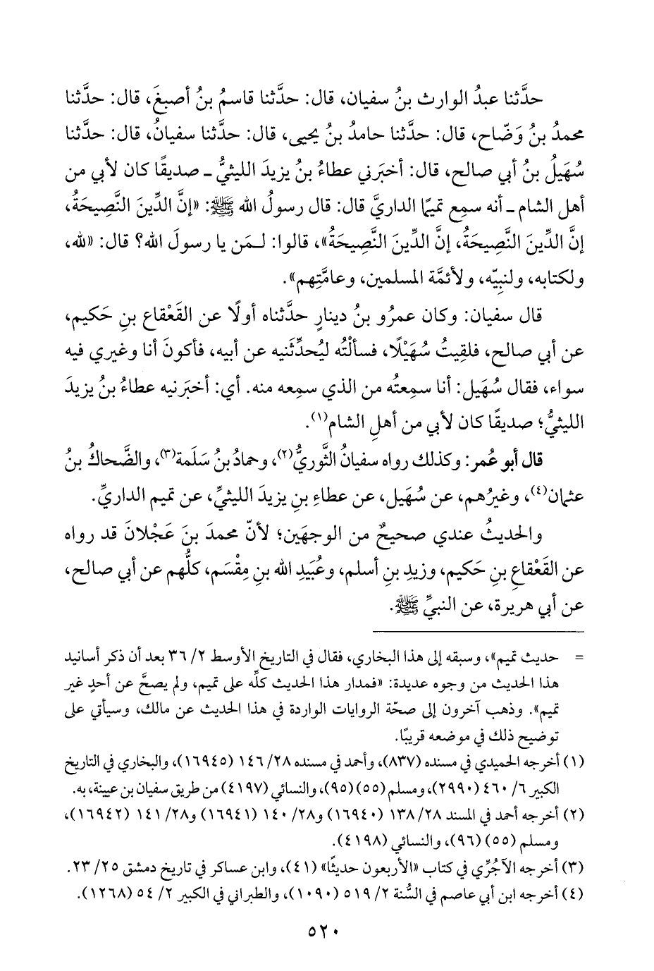 حدَّثنا عبدُ الوارث بنُ سفيان، قال: حدَّثنا قاسمُ بنُ أصبغَ، قال: حدَّثنا محمدُ بنُ وَضّاح، قال: حدَّثنا حامدُ بنُ يحيى، قال: حدَّثنا سفيانُ، قال: حدَّثنا سُهَيلُ بنُ أبي صالح، قال: أخبَرني عطاءُ بنُ يزيدَ الليثيُّ -صديقًا كان لأبي من أهل الشام- أنه سمِع تميمًا الداريَّ قال: قال رسولُ اللَّه -صلى اللَّه عليه وسلم-: "إنَّ الدِّينَ النَّصِيحَةُ، إنَّ الدِّينَ النَّصِيحَةُ، إنَّ الدِّينَ النَّصِيحَةُ"، قالوا: لمَن يا رسولَ اللَّه؟ قال: "للَّه، ولكتابه، ولنبِيّه، ولأئمَّة المسلمين، وعامَّتِهم".