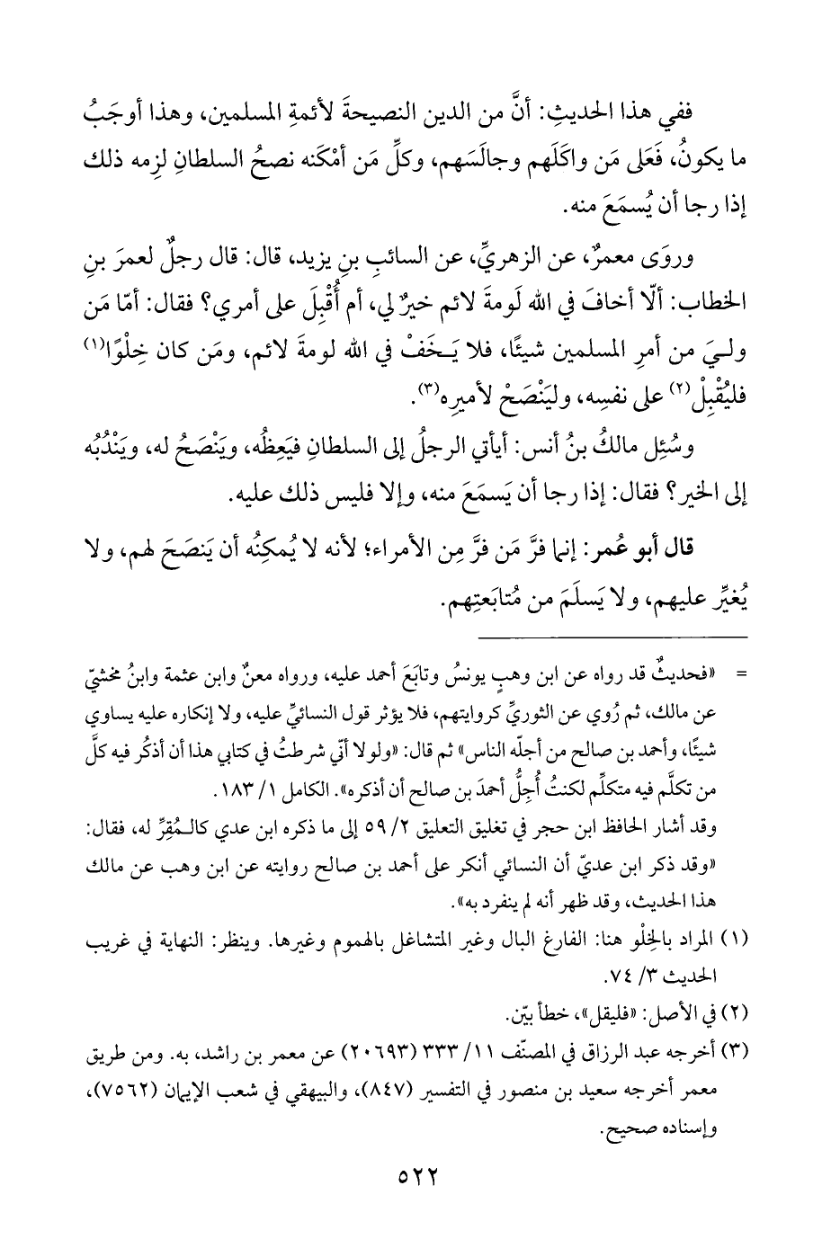 وروَى معمرٌ، عن الزهريِّ، عن السائبِ بنِ يزيد، قال: قال رجلٌ لعمرَ بنِ الخطاب: ألّا أخافَ في اللَّه لَومةَ لائم خير لي، أم أُقْبِلَ على أمري؟ فقال: أمّا مَن وليَ من أمرِ المسلمين شيئًا، فلا يَخَفْ في اللَّه لومةَ لائم، ومَن كان خِلْوًا (¬١) فليُقبِلْ (¬٢) على نفسِه، وليَنْصَحْ لأميرِه (¬٣).