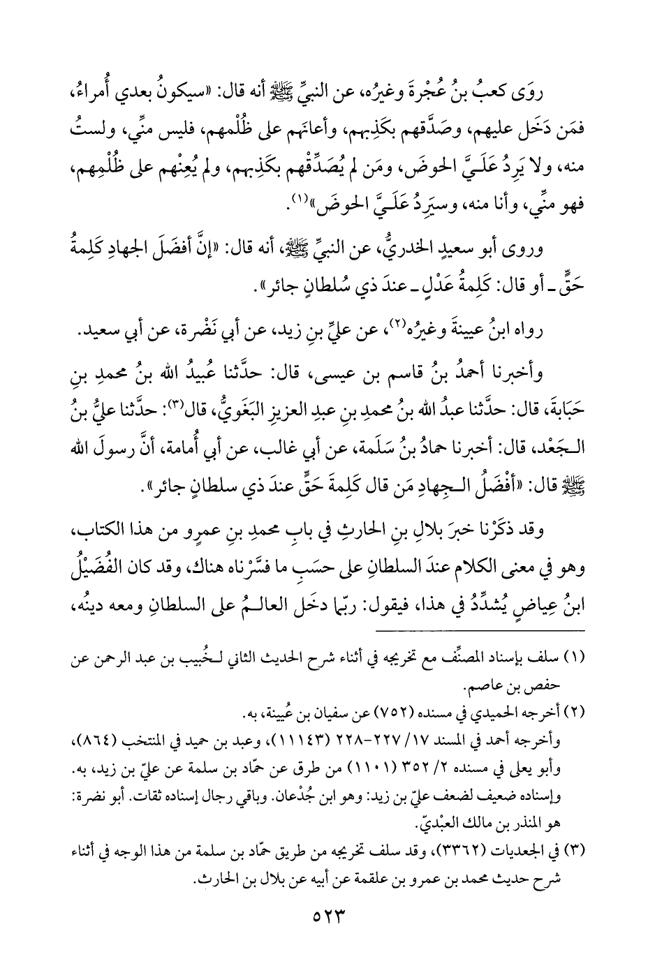 روَى كعبُ بنُ عُجْرةَ وغيرُه، عن النبيِّ -صلى اللَّه عليه وسلم- أنه قال: "سيكونُ بعدي أُمراءُ، فمَن دَخَل عليهم، وصَدَّقهم بكَذِبهم، وأعانَهم على ظُلْمهم، فليس منِّي، ولستُ منه، ولا يَرِدُ عَلَيَّ الحوضَ، ومَن لم يُصَدِّقْهم بكَذِبهم، ولم يُعِنْهم على ظُلْمِهم، فهو منِّي، وأنا منه، وسيَرِدُ عَلَيَّ الحوضَ" (¬١).