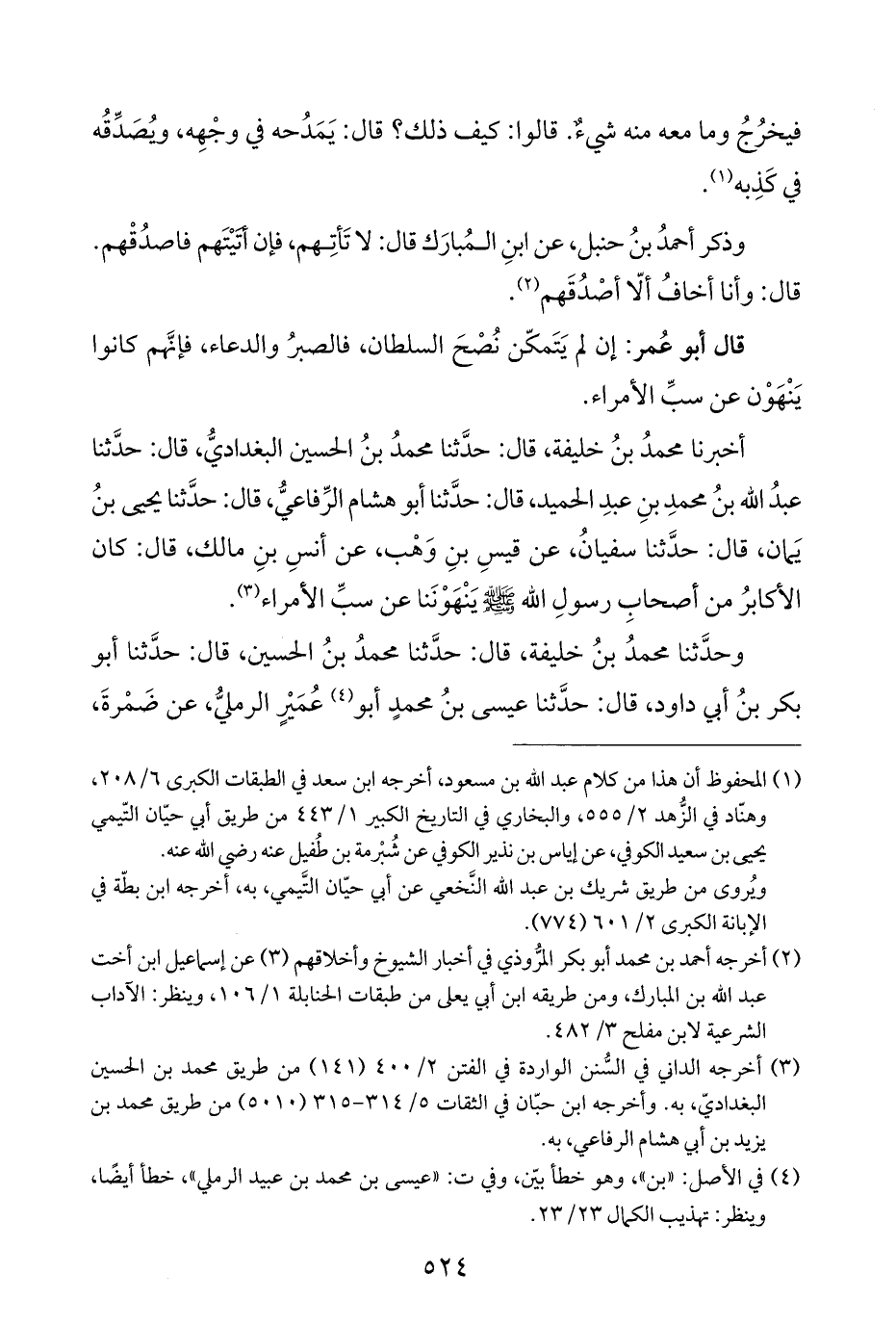 أخبرنا محمدُ بنُ خليفة، قال: حدَّثنا محمدُ بنُ الحسين البغداديُّ، قال: حدَّثنا عبدُ اللَّه بنُ محمدِ بنِ عبدِ الحميد، قال: حدَّثنا أبو هشام الرِّفاعيُّ، قال: حدَّثنا يحيى بنُ يَمان، قال: حدَّثنا سفيانُ، عن قيسِ بنِ وَهْب، عن أنسِ بنِ مالك، قال: كان الأكابرُ من أصحابِ رسولِ اللَّه -صلى اللَّه عليه وسلم- يَنْهَوْنَنا عن سبِّ الأمراء (¬٣).