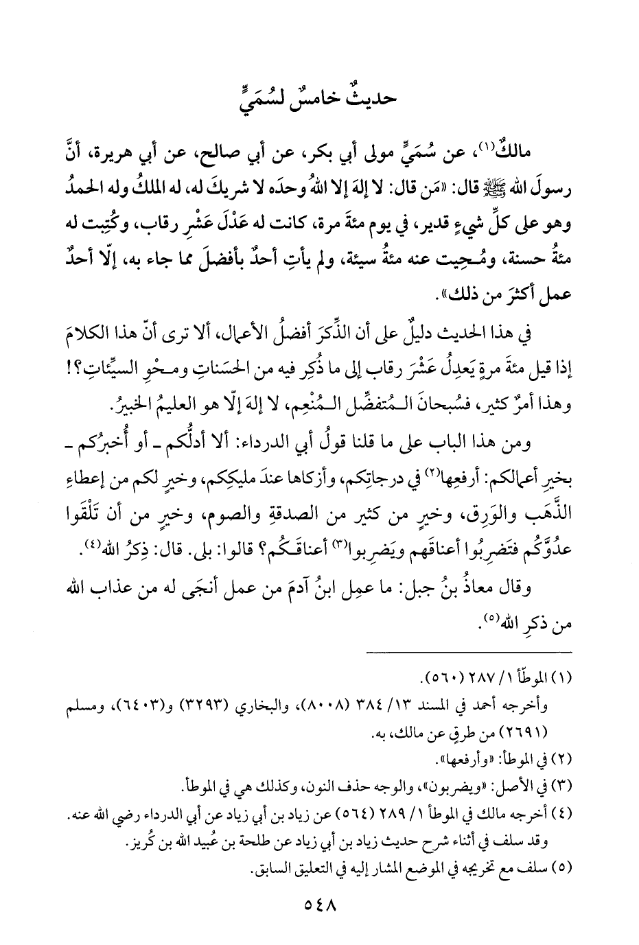 مالكٌ (¬١)، عن سُمَيٍّ مولى أبي بكر، عن أبي صالح، عن أبي هريرة، أنَّ رسولَ اللَّه -صلى اللَّه عليه وسلم- قال: "مَن قال: لا إلهَ إلا اللَّهُ وحدَه لا شريكَ له، له الملكُ وله الحمدُ وهو على كلِّ شيءٍ قدير، في يوم مئةَ مرة، كانت له عَدْلَ عَشْرِ رقاب، وكُتِبت له مئةُ حسنة، ومُحِيت عنه مئةُ سيئة، ولم يأتِ أحدٌ بأفضلَ مما جاء به، إلّا أحدٌ عمل أكثرَ من ذلك".