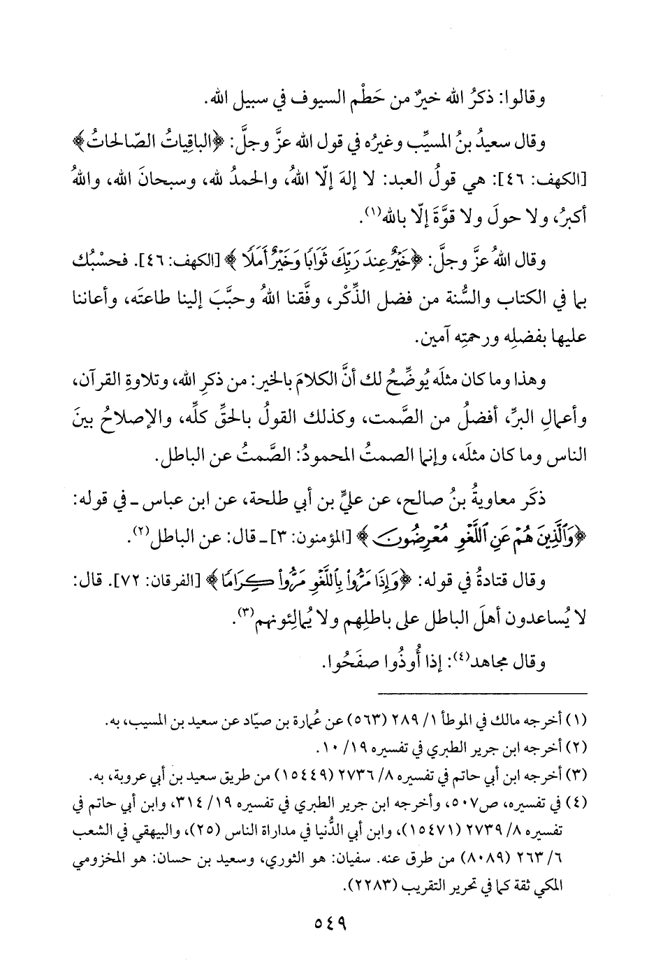 وقال سعيدُ بنُ المسيِّب وغيرُه في قول اللَّه عزَّ وجلَّ: {الْبَاقِيَاتُ الصَّالِحَاتُ} [الكهف: ٤٦]: هي قولُ العبد: لا إلهَ إلّا اللَّهُ، والحمدُ للَّه، وسبحانَ اللَّه، واللَّهُ أكبرُ، ولا حولَ ولا قوَّةَ إلّا باللَّه (¬١).