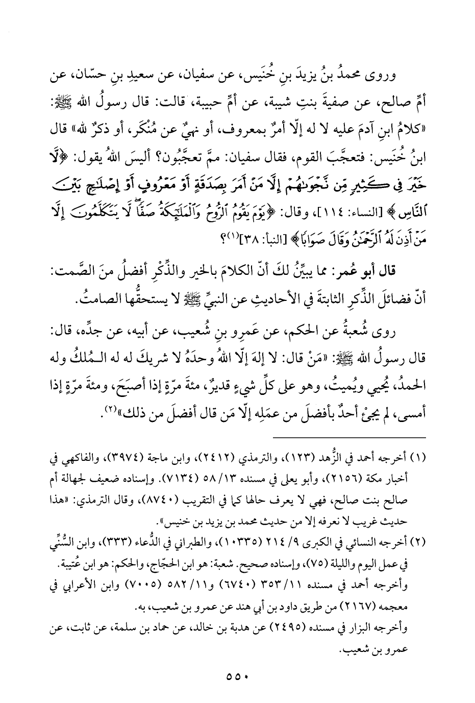 وروى محمدُ بنُ يزيدَ بنِ خُنَيس، عن سفيان، عن سعيدِ بنِ حسّان، عن أمِّ صالح، عن صفيةَ بنتِ شيبة، عن أمِّ حبيبة، قالت: قال رسولُ اللَّه -صلى اللَّه عليه وسلم-: "كلامُ ابنِ آدمَ عليه لا له إلّا أمرٌ بمعروف، أو نهيٌ عن مُنْكَر، أو ذكرٌ للَّه" قال ابنُ خُنَيس: فتعجَّبَ القوم، فقال سفيان: ممَّ تعجَّبُون؟ أليسَ اللَّهُ يقول: {لَا خَيْرَ فِي كَثِيرٍ مِنْ نَجْوَاهُمْ إِلَّا مَنْ أَمَرَ بِصَدَقَةٍ أَوْ مَعْرُوفٍ أَوْ إِصْلَاحٍ بَيْنَ النَّاسِ} [النساء: ١١٤]، وقال: {يَوْمَ يَقُومُ الرُّوحُ وَالْمَلَائِكَةُ صَفًّا لَا يَتَكَلَّمُونَ إِلَّا مَنْ أَذِنَ لَهُ الرَّحْمَنُ وَقَالَ صَوَابًا} [النبأ: ٣٨] (¬١)؟