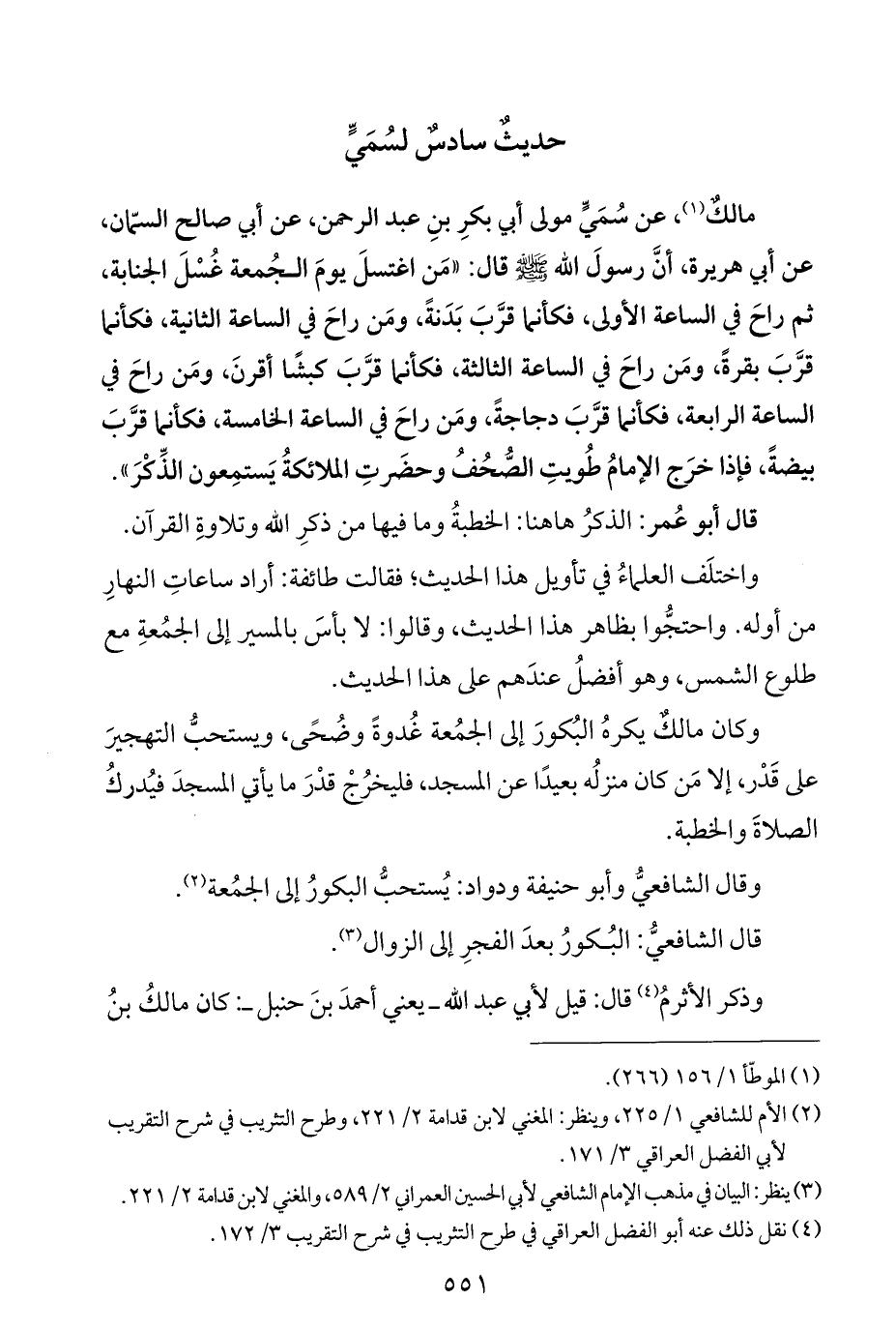 مالكٌ (¬١)، عن سُمَيٍّ مولى أبي بكرِ بنِ عبد الرحمن، عن أبي صالح السمّان، عن أبي هريرة، أنَّ رسولَ اللَّه -صلى اللَّه عليه وسلم- قال: "مَن اغتسلَ يومَ الجُمعة غُسْلَ الجنابة، ثم راحَ في الساعة الأولى، فكأنما قرَّبَ بَدَنةً، ومَن راحَ في الساعة الثانية، فكأنما قرَّبَ بقرةً، ومَن راحَ في الساعة الثالثة، فكأنما قرَّبَ كبشًا أقرنَ، ومَن راحَ في الساعة الرابعة، فكأنما قرَّبَ دجاجةً، ومَن راحَ في الساعة الخامسة، فكأنما قرَّبَ بيضةً، فإذا خرَج الإمامُ طُويتِ الصُّحُفُ وحضَرتِ الملائكةُ يَستمِعون الذِّكْرَ".