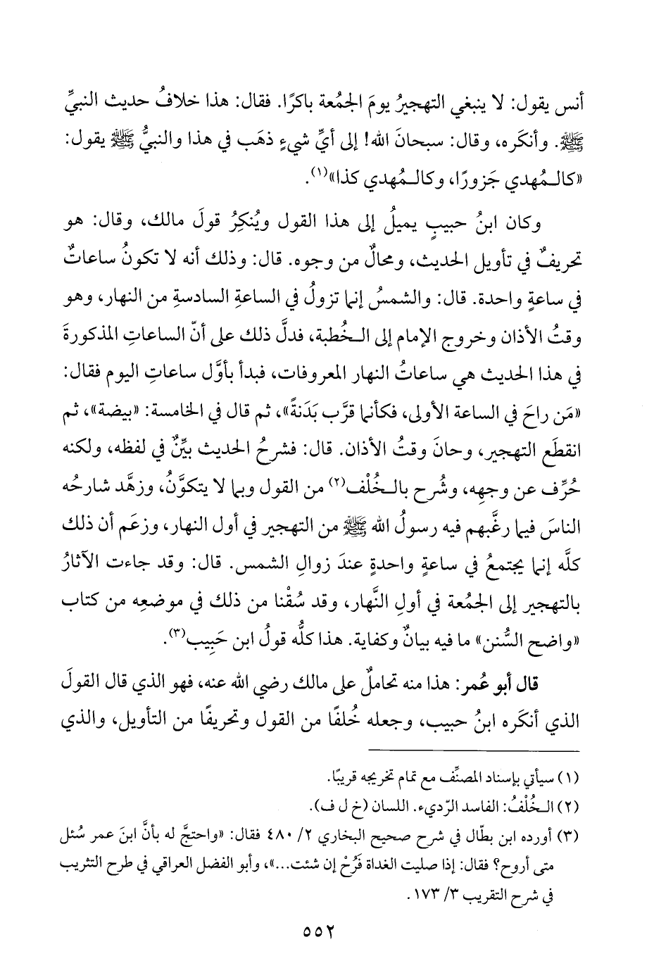 وكان ابنُ حبيبٍ يميلُ إلى هذا القول ويُنكِرُ قولَ مالك، وقال: هو تحريفٌ في تأويل الحديث، ومحالٌ من وجوه. قال: وذلك أنَّه لا تكونُ ساعاتٌ في ساعةٍ واحدة. قال: والشمسُ إنما تزولُ في الساعةِ السادسةِ من النهار، وهو وقتُ الأذان وخروج الإِمام إلى الخُطبة، فدلَّ ذلك على أنّ الساعاتِ المذكورةَ في هذا الحديث هي ساعاتُ النهار المعروفات، فبدأ بأوَّل ساعاتِ اليوم فقال: "مَن راحَ في الساعة الأولى، فكأنما قرَّب بَدَنةً"، ثم قال في الخامسة: "بيضة"، ثم انقطَع التهجير، وحانَ وقتُ الأذان. قال: فشرحُ الحديث بيِّنٌ في لفظه، ولكنه حُرِّف عن وجهِه، وشُرح بالخُلْف (¬٢) من القول وبما لا يتكوَّنُ، وزهَّد شارحُه الناسَ فيما رغَّبهم فيه رسولُ اللَّه -صلى اللَّه عليه وسلم- من التهجير في أول النهار، وزعَم أن ذلك كلَّه إنما يجتمعُ في ساعةٍ واحدةٍ عندَ زوالِ الشمس. قال: وقد جاءت الآثارُ بالتهجير إلى الجمُعة في أولِ النَّهار، وقد سُقْنا من ذلك في موضعِه من كتاب "واضح السُّنن" ما فيه بيانٌ وكفاية. هذا كلُّه قولُ ابن حَبِيب (¬٣).