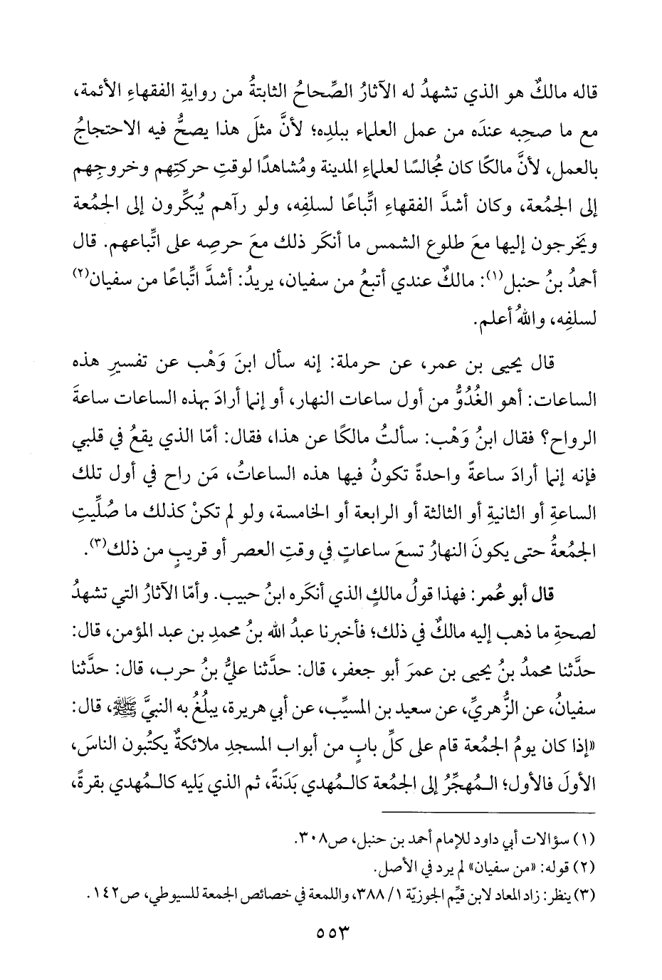 قاله مالكٌ هو الذي تشهدُ له الآثارُ الصِّحاحُ الثابتةُ من روايةِ الفقهاءِ الأئمة، مع ما صحِبه عندَه من عمل العلماء ببلدِه؛ لأنَّ مثلَ هذا يصحُّ فيه الاحتجاجُ بالعمل، لأنَّ مالكًا كان مجُالسًا لعلماءِ المدينة ومُشاهدًا لوقتِ حركتِهم وخروجِهم إلى الجمُعة، وكان أشدَّ الفقهاءِ اتِّباعًا لسلفِه، ولو رآهم يُبكِّرون إلى الجمُعة ويَخرجون إليها معَ طلوع الشمس ما أنكَر ذلك معَ حرصِه على اتِّباعهم. قال أحمدُ بنُ حنبل (¬١): مالكٌ عندي أتبعُ من سفيان، يريدُ: أشدَّ اتِّباعًا من سفيان (¬٢) لسلفِه، واللَّهُ أعلم.