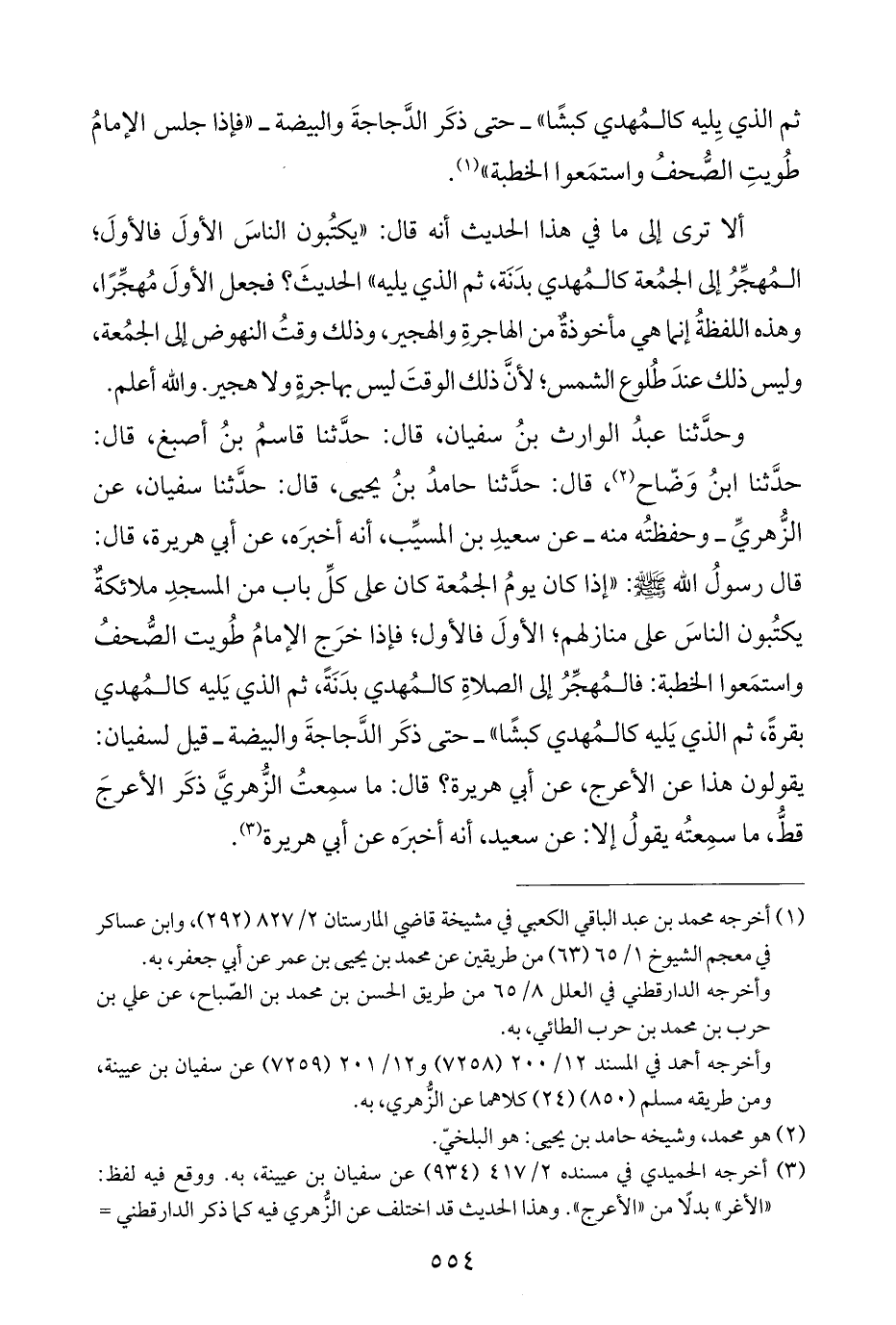 وحدَّثنا عبدُ الوارث بنُ سفيان، قال: حدَّثنا قاسمُ بنُ أصبغ، قال: حدَّثنا ابنُ وَضّاح (¬٢)، قال: حدَّثنا حامدُ بنُ يحيى، قال: حدَّثنا سفيان، عن الزُّهريِّ -وحفظتُه منه- عن سعيدِ بن المسيِّب، أنَّه أخبرَه، عن أبي هريرة، قال: قال رسولُ اللَّه -صلى اللَّه عليه وسلم-: "إذا كان يومُ الجمُعة كان على كلِّ باب من المسجدِ ملائكةٌ يكتُبون الناسَ على منازلهم؛ الأولَ فالأول، فإذا خرَج الإمامُ طُويت الصُّحفُ واستمَعوا الخطبة: فالمُهجِّرُ إلى الصلاةِ كالمُهدي بدَنَةً، ثم الذي يَليه كالمُهدي بقرةً، ثم الذي يَليه كالمُهدي كبشًا" -حتى ذكَر الدَّجاجةَ والبيضة- قيل لسفيان: يقولون هذا عن الأعرج، عن أبي هريرة؟ قال: ما سمِعتُ الزُّهريَّ ذكَر الأعرجَ قطّ، ما سمِعتُه يقولُ إلا: عن سعيد، أنَّه أخبرَه عن أبي هريرة (¬٣).