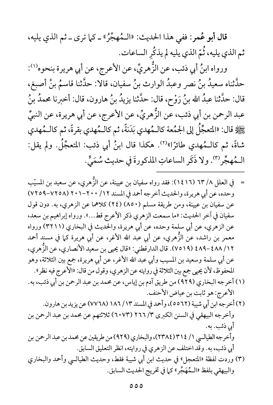 (¬٣) وردت لفظة "المتعجل" في حديث ابن أبي شيبة فقط، وحديث الطيالسي وأحمد والبخاري والبيهقي بلفظ "المُهَجِّر" كما في تخريج الحديث السابق.