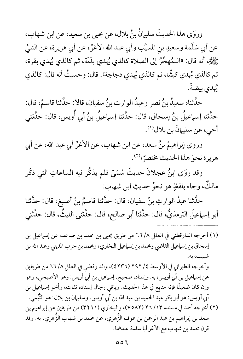وروَى هذا الحديثَ سليمانُ بنُ بلال، عن يحيى بن سعيد، عن ابن شهاب، عن أبي سَلَمة وسعيدِ بنِ المسيِّب وأبي عبد اللَّه الأغرِّ، عن أبي هريرة، عن النبيِّ -صلى اللَّه عليه وسلم-، أنَّه قال: "المُهجِّرُ إلى الصلاة كالذي يُهدي بدَنَة، ثم كالذي يُهدي بقرة، ثم كالذي يُهدي كبشًا، ثم كالذي يُهدي دجاجة". قال: وحسبتُ أنَّه قال: كالذي يُهدي بيضةً.