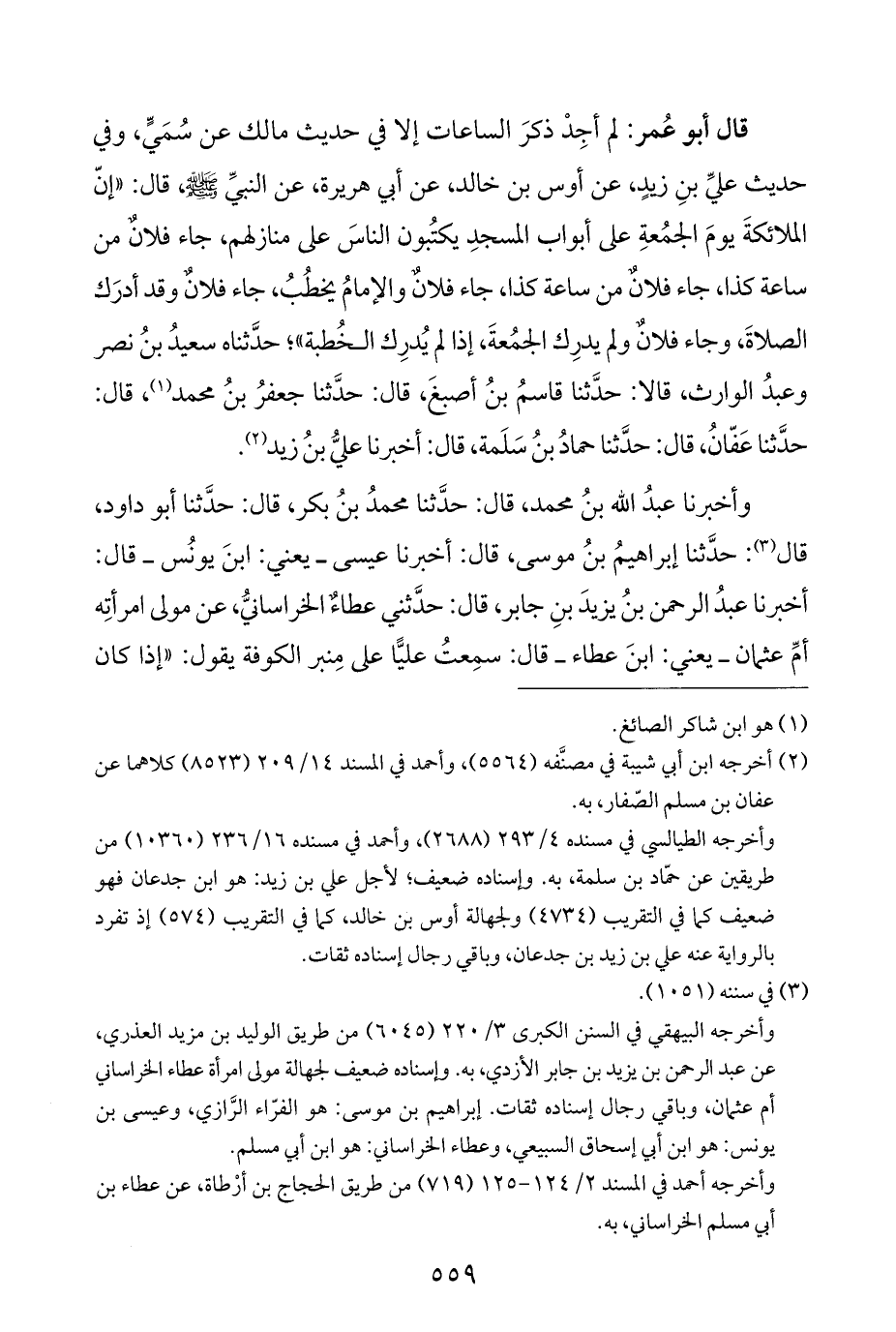 قال أبو عُمر: لم أجِدْ ذكرَ الساعات إلا في حديث مالك عن سُمَيٍّ، وفي حديث عليِّ بنِ زيدٍ، عن أوس بن خالد، عن أبي هريرة، عن النبيِّ -صلى اللَّه عليه وسلم-، قال: "إنّ الملائكةَ يومَ الجمُعةِ على أبواب المسجدِ يكتُبون الناسَ على منازلهم، جاء فلانٌ من ساعة كذا، جاء فلانٌ من ساعة كذا، جاء فلان والإمامُ يخطُبُ، جاء فلانٌ وقد أدرَك الصلاةَ، وجاء فلانٌ ولم يدرِك الجمُعةَ، إذا لم يُدرِك الخُطبة"؛ حدَّثناه سعيدُ بنُ نصر وعبدُ الوارث، قالا: حدَّثنا قاسمُ بنُ أصبغَ، قال: حدَّثنا جعفرُ بنُ محمد (¬١)، قال: حدَّثنا عَفّانُ، قال: حدَّثنا حمادُ بنُ سَلَمة، قال: أخبرنا عليُّ بنُ زيد (¬٢).