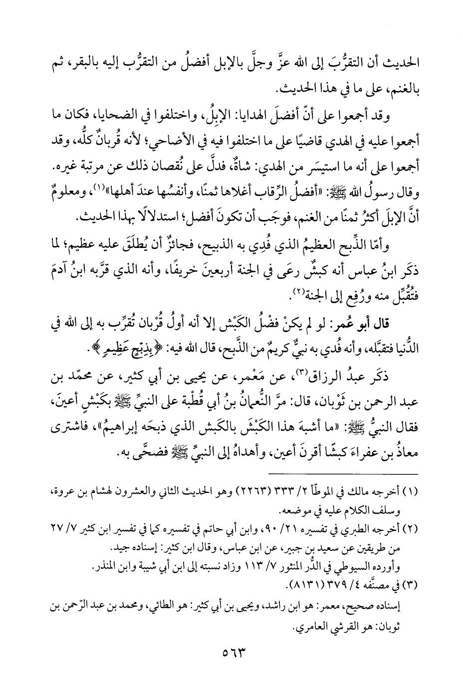 وأمّا الذِّبح العظيمُ الذي فُدِي به الذبيح، فجائزٌ أن يُطلَقَ عليه عظيم؛ لما ذكَر ابنُ عبَّاس أنَّه كبشٌ رعَى في الجنة أربعينَ خريفًا، وأنه الذي قرَّبه ابنُ آدمَ فتُقُبِّل منه ورُفِع إلى الجنة (¬٢).