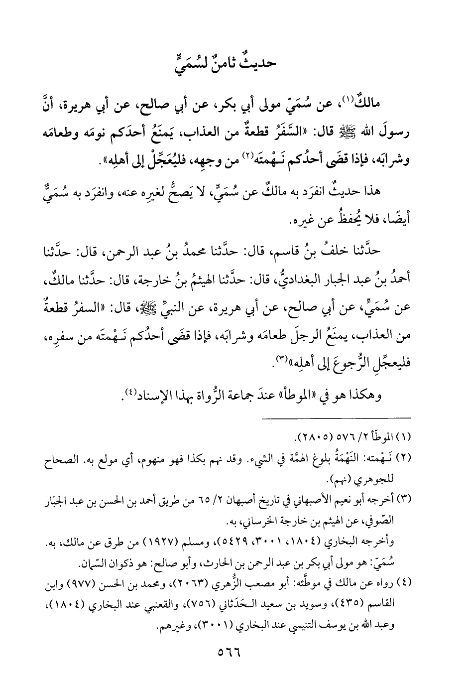 حدَّثنا خلفُ بنُ قاسم، قال: حدَّثنا محمدُ بنُ عبد الرحمن، قال: حدَّثنا أحمدُ بنُ عبد الجبار البغداديُّ، قال: حدَّثنا الهيثمُ بنُ خارجة، قال: حدَّثنا مالكٌ، عن سُمَيٍّ، عن أبي صالح، عن أبي هريرة، عن النبيِّ -صلى اللَّه عليه وسلم-، قال: "السفرُ قطعةٌ من العذاب، يمنَعُ الرجلَ طعامَه وشرابَه، فإذا قضَى أحدُكم نَهْمتَه من سفرِه، فليعجِّلِ الرُّجوعَ إلى أهلِه" (¬٣).