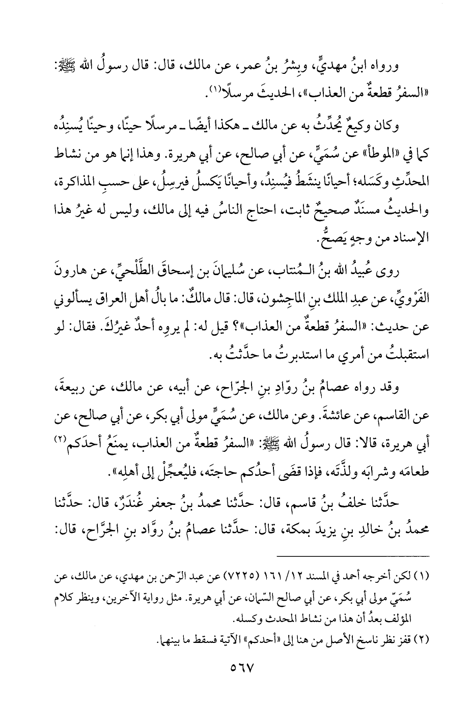 ورواه ابنُ مهديٍّ، وبِشرُ بنُ عمر، عن مالك، قال: قال رسولُ اللَّه -صلى اللَّه عليه وسلم-: "السفرُ قطعةٌ من العذاب"، الحديثَ مرسلًا (¬١).