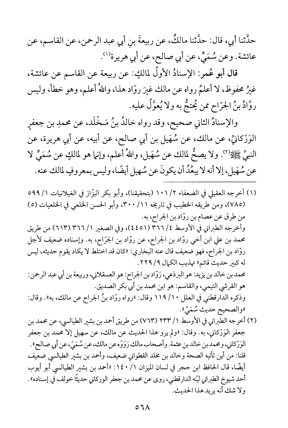 قال أبو عُمر: الإسنادُ الأولُ لمالكٍ: عن ربيعة عن القاسم عن عائشة، غيرُ محفوظ، لا أعلمُ رواه عن مالك غيرَ روّاد هذا، واللَّهُ أعلم، وهو خطأ، وليس روَّادُ بنُ الجرّاح ممن يُحتجُّ به ولا يُعوَّلُ عليه.