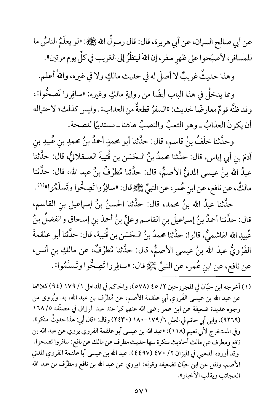 (¬١) أخرجه ابن حبّان في المجروحين ٢/ ٤٥ (٥٧٨)، والحاكم في المدخل ١/ ١٧٩ (٩٤) كلاهما عن عبد اللَّه بن عيسى الفَروي أبي علقمة الأصم، عن مُطرِّف بن عبد اللَّه، به. ويُروى من وجوه عديدة ضعيفة عن ابن عمر رضي اللَّه عنهما كما عند عبد الرزاق في مصنّفه ٥/ ١٦٨ (٩٢٦٩)، وابن أبي حاتم في العلل ٦/ ١٧٩ - ١٨٠ (٢٤٣٠) وقال: "قال أبي: هذا حديثٌ منكر". وفي المستخرج لأبي نعيم (١١٨): "عبد اللَّه بن عيسى أبو علقمة الفروي يروي عن عبد اللَّه بن نافع ومطرف عن مالك أحاديث منكرة منها حديث مطرف عن مالك عن نافع: سافروا تصحوا. وقد أورده الذهبي في الميزان ٢/ ٤٧٠ (٤٤٩٧): عبد اللَّه بن عيسى أبا علقمة الفروي المدني الأصم، ونقل عن ابن حبّان تضعيفه وقوله: "يروي عن عبد اللَّه بن نافع ومطرِّف بن عبد اللَّه العجائب ويقلب الأخبار".