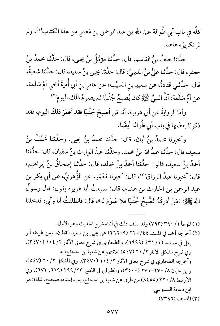 حدَّثنا خلفُ بنُ القاسم، قال: حدَّثنا مؤمَّلُ بنُ يحيى، قال: حدَّثنا محمدُ بنُ جعفر، قال: حدَّثنا عليُّ بنُ المدينيِّ، قال: حدَّثنا يحيى بنُ سعيد، قال: حدَّثنا شعبةُ، قال: حدَّثني قتادةُ، عن سعيدِ بنِ المسيِّب، عن عامرِ بنِ أبي أُميةَ أخي أمِّ سَلَمة، عن أمِّ سَلَمة، أنَّ النبيَّ -صلى اللَّه عليه وسلم- كان يُصبحُ جُنُبًا ثم يصومُ ذلك اليوم (¬٢).