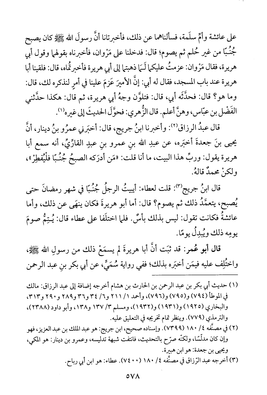 (¬١) حديث أبي بكر بن عبد الرحمن بن الحارث بن هشام أخرجه إضافة إلى عبد الرزاق: مالك في الموطأ (٧٩٤) و (٧٩٥) و (٧٩٦)، وأحمد ١/ ٢١١ و ٦/ ٣٤ و ٣٦ و ٢٨٩ و ٢٩٠ و ٣١٣، والبخاري (١٩٢٥) و (١٩٣١) و (١٩٣٢)، ومسلم ٣/ ١٣٧ و ١٣٨، وأبو داود (٢٣٨٨)، والترمذي (٧٧٩). وينظر تمام تخريجه في التعليق عليه.