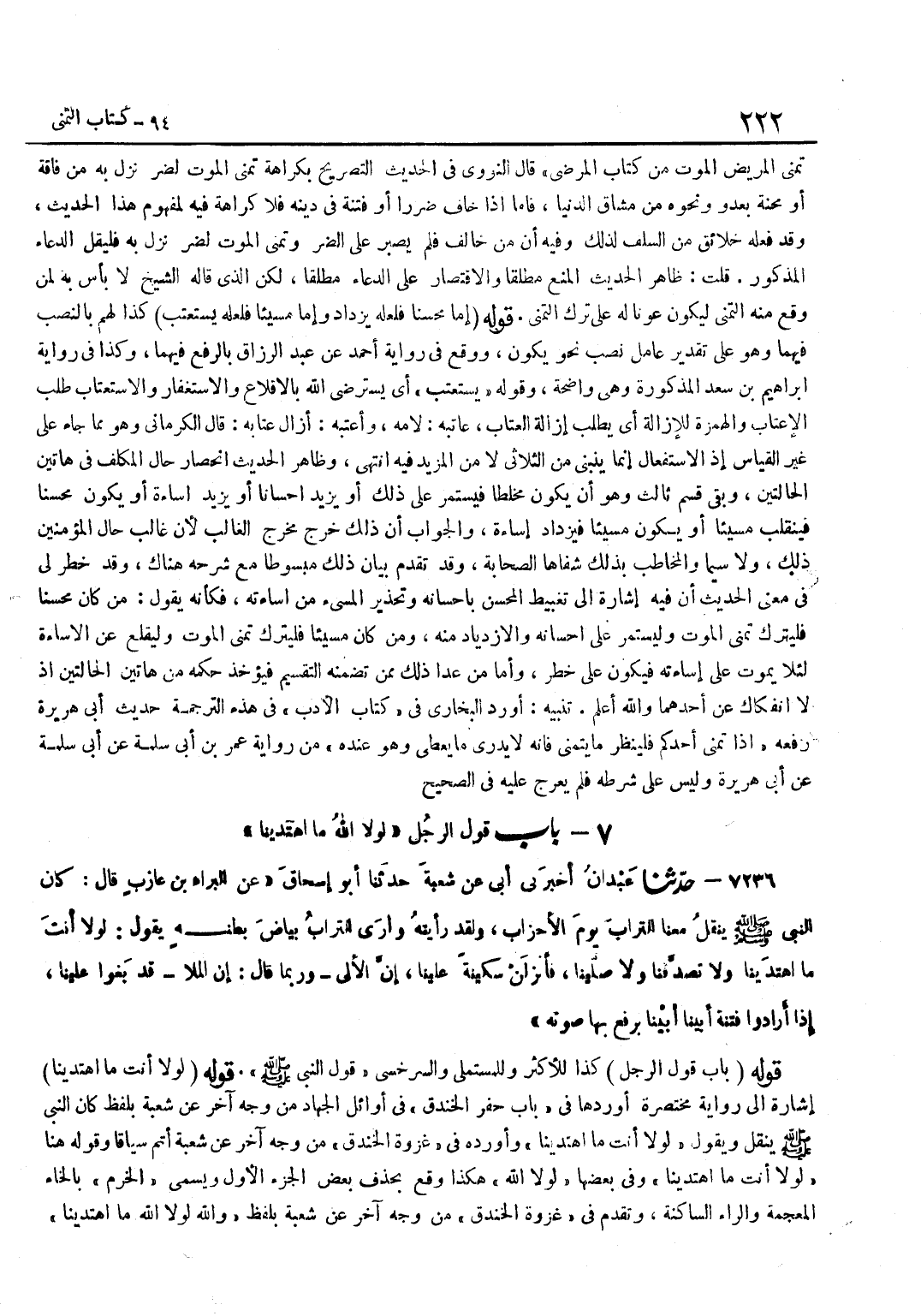 تَمَنِّي الْمَرِيضِ الْمَوْتَ مِنْ كِتَابِ الْمَرْضَى قَالَ النَّوَوِيُّ فِي الْحَدِيثِ التَّصْرِيحُ بِكَرَاهَةِ تَمَنِّي الْمَوْتِ لِضُرٍّ نَزَلَ بِهِ مِنْ فَاقَةٍ أَوْ مِحْنَةٍ بِعَدُوٍّ وَنَحْوِهِ مِنْ مَشَاقِّ الدُّنْيَا فَأَمَّا إِذَا خَافَ ضَرَرًا أَوْ فِتْنَةً فِي دِينِهِ فَلَا كَرَاهَةَ فِيهِ لِمَفْهُومِ هَذَا الْحَدِيثِ وَقَدْ فَعَلَهُ خلائق من السّلف لذَلِك وَفِيهِ أَنَّ مَنْ خَالَفَ فَلَمْ يَصْبِرْ عَلَى الضُّرِّ وَتَمَنَّى الْمَوْتَ لِضُرٍّ نَزَلَ بِهِ فَلْيَقُلِ الدُّعَاءَ الْمَذْكُورَ قُلْتُ ظَاهِرُ الْحَدِيثِ الْمَنْعُ مُطْلَقًا وَالِاقْتِصَارُ عَلَى الدُّعَاءِ مُطْلَقًا لَكِنَّ الَّذِي قَالَهُ الشَّيْخُ لَا بَأْسَ بِهِ لِمَنْ وَقَعَ مِنْهُ التَّمَنِّي ليَكُون عونا لَهُ عَلَى تَرْكِ التَّمَنِّي قَوْلُهُ إِمَّا مُحْسِنًا فَلَعَلَّهُ يَزْدَادُ وَإِمَّا مُسِيئًا فَلَعَلَّهُ يُسْتَعْتَبُ كَذَا لَهُمْ بِالنَّصْبِ فِيهِمَا وَهُوَ عَلَى تَقْدِيرِ عَامِلِ نَصْبٍ نَحْوُ يَكُونُ وَوَقَعَ فِي رِوَايَةِ أَحْمَدَ عَنْ عَبْدِ الرَّزَّاقِ بِالرَّفْعِ فِيهِمَا وَكَذَا فِي رِوَايَةِ إِبْرَاهِيمَ بْنِ سَعْدٍ الْمَذْكُورَةِ وَهِيَ وَاضِحَةٌ وَقَوْلُهُ يُسْتَعْتَبُ أَيْ يَسْتَرْضِي اللَّهَ بِالْإِقْلَاعِ وَالِاسْتِغْفَارِ وَالِاسْتِعْتَابُ طَلَبُ الْإِعْتَابِ وَالْهَمْزَةُ لِلْإِزَالَةِ أَيْ يَطْلُبُ إِزَالَةَ الْعِتَابِ عَاتَبَهُ لَامَهُ وَأَعْتَبَهُ أَزَالَ عِتَابَهُ قَالَ الْكِرْمَانِيُّ وَهُوَ مِمَّا جَاءَ عَلَى غَيْرِ الْقِيَاسِ إِذْ الِاسْتِفْعَالُ إِنَّمَا يَنْبَنِي مِنَ الثُّلَاثِيِّ لَا مِنَ الْمَزِيدِ فِيهِ انْتَهَى وَظَاهِرُ الْحَدِيثِ انْحِصَارُ حَالِ الْمُكَلَّفِ فِي هَاتَيْنِ الْحَالَتَيْنِ وَبَقِيَ قِسْمٌ ثَالِثٌ وَهُوَ أَنْ يَكُونَ مُخَلِّطًا فَيَسْتَمِرَّ عَلَى ذَلِكَ أَوْ يَزِيدَ إِحْسَانًا أَوْ يَزِيدَ إِسَاءَةً أَوْ يَكُونَ مُحْسِنًا فَيَنْقَلِبَ مُسِيئًا أَوْ يَكُونَ مُسِيئًا فَيَزْدَادَ إِسَاءَةً وَالْجَوَابُ أَنَّ ذَلِكَ خَرَجَ مَخْرَجَ الْغَالِبِ لِأَنَّ غَالِبَ حَالِ الْمُؤْمِنِينَ ذَلِكَ وَلَا سِيَّمَا وَالْمُخَاطَبُ بِذَلِكَ شِفَاهًا الصَّحَابَةُ وَقَدْ تَقَدَّمَ بَيَانُ ذَلِكَ مَبْسُوطًا مَعَ شَرْحِهِ هُنَاكَ وَقَدْ خَطَرَ لِي فِي مَعْنَى الْحَدِيثِ أَنَّ فِيهِ إِشَارَةٌ إِلَى تَغْبِيطِ الْمُحْسِنِ بِإِحْسَانِهِ وَتَحْذِيرِ الْمُسِيءِ مِنْ إِسَاءَتِهِ فَكَأَنَّهُ يَقُولُ مَنْ كَانَ مُحْسِنًا فَلْيَتْرُكْ تَمَنِّيَ الْمَوْتِ وَلْيَسْتَمِرَّ عَلَى إِحْسَانِهِ وَالِازْدِيَادِ مِنْهُ وَمَنْ كَانَ مُسِيئًا فَلْيَتْرُكْ تَمَنِّيَ الْمَوْتِ وَلْيُقْلِعْ عَنِ الْإِسَاءَةِ لِئَلَّا يَمُوتَ عَلَى إِسَاءَتِهِ فَيَكُونَ عَلَى خَطَرٍ وَأَمَّا مَنْ عَدَا ذَلِكَ مِمَّنْ تَضَمَّنَهُ التَّقْسِيمُ فَيُؤْخَذُ حُكْمُهُ مِنْ هَاتَيْنِ الْحَالَتَيْنِ إِذْ لَا انْفِكَاكَ عَنْ أَحَدِهِمَا وَاللَّهُ أَعْلَمُ تَنْبِيهٌ أَوْرَدَ الْبُخَارِيُّ فِي كِتَابِ الْأَدَبِ فِي هَذِهِ التَّرْجَمَةِ حَدِيثَ أَبِي هُرَيْرَةَ رَفَعَهُ إِذَا تَمَنَّى أَحَدُكُمْ فَلْيَنْظُرْ مَا يَتَمَنَّى فَإِنَّهُ لَا يَدْرِي مَا يُعْطَى وَهُوَ عِنْدَهُ مِنْ رِوَايَةِ عُمَرَ بْنِ أَبِي سَلَمَةَ عَنْ أَبِي سَلَمَةَ عَنْ أَبِي هُرَيْرَةَ وَلَيْسَ عَلَى شَرطه فَلم يعرج عَلَيْهِ فِي الصَّحِيح