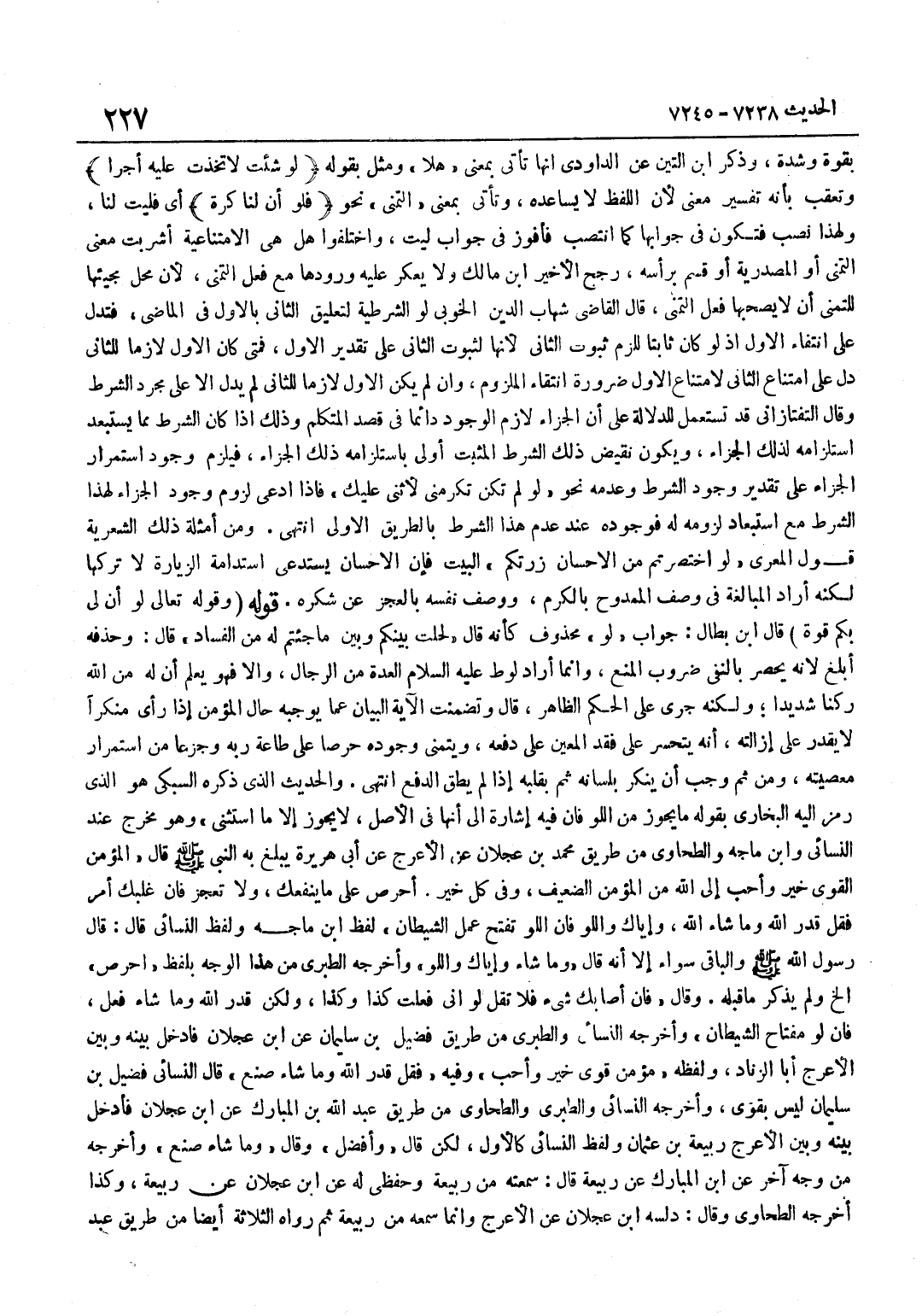بِقُوَّة وَشدَّة وَذكر بن التِّينِ عَنِ الدَّاوُدِيِّ أَنَّهَا تَأْتِي بِمَعْنَى هَلَّا وَمَثَّلَ بِقَوْلِهِ لَوْ شِئْتَ لَاتَّخَذْتَ عَلَيْهِ أَجْرًا وَتُعُقِّبَ بِأَنَّهُ تَفْسِيرُ مَعْنًى لِأَنَّ اللَّفْظَ لَا يُسَاعِدُهُ وَتَأْتِي بِمَعْنَى التَّمَنِّي نَحْوَ فَلَوْ أَنَّ لنا كرة أَيْ فَلَيْتَ لَنَا وَلِهَذَا نُصِبَ فَتَكُونُ فِي جَوَابِهَا كَمَا انْتَصَبَ فَأَفُوزَ فِي جَوَابِ لَيْتَ وَاخْتَلَفُوا هَلْ هِيَ الِامْتِنَاعِيَّةُ أُشْرِبَتْ مَعْنَى التَّمَنِّي أَوِ الْمَصْدَرِيَّةُ أَوْ قِسْمٌ بِرَأْسِهِ رَجَّحَ الْأَخِيرَ بن مَالِكٍ وَلَا يُعَكِّرُ عَلَيْهِ وُرُودُهَا مَعَ فِعْلِ التَّمَنِّي لِأَنَّ مَحَلَّ مَجِيئِهَا لِلتَّمَنِّي أَنْ لَا يَصْحَبَهَا فِعْلُ التَّمَنِّي قَالَ الْقَاضِي شِهَابُ الدِّينِ الْخُوبِيُّ لَوِ الشَّرْطِيَّةُ لِتَعْلِيقِ الثَّانِي بِالْأَوَّلِ فِي الْمَاضِي فَتَدُلُّ عَلَى انْتِفَاءِ الْأَوَّلِ إِذْ لَوْ كَانَ ثَابِتًا لَلَزِمَ ثُبُوتُ الثَّانِي لِأَنَّهَا لِثُبُوتِ الثَّانِي عَلَى تَقْدِيرِ الْأَوَّلِ فَمَتَى كَانَ الْأَوَّلُ لَازِمًا لِلثَّانِي دَلَّ عَلَى امْتِنَاعِ الثَّانِي لِامْتِنَاعِ الأول ضَرُورَة انتقاء الْمَلْزُومِ وَإِنْ لَمْ يَكُنِ الْأَوَّلُ لَازِمًا لِلثَّانِي لَمْ يَدُلَّ إِلَّا عَلَى مُجَرَّدِ الشَّرْطِ وَقَالَ التَّفْتَازَانِيُّ قَدْ تُسْتَعْمَلُ لِلدَّلَالَةِ عَلَى أَنَّ الْجَزَاءَ لَازِمُ الْوُجُودِ دَائِمًا فِي قَصْدِ الْمُتَكَلِّمِ وَذَلِكَ إِذَا كَانَ الشَّرْطُ مِمَّا يُسْتَبْعَدُ اسْتِلْزَامُهُ لِذَلِكَ الْجَزَاءِ وَيَكُونُ نَقِيضُ ذَلِكَ الشَّرْطِ الْمُثْبَتِ أَوْلَى بِاسْتِلْزَامِهِ ذَلِكَ الْجَزَاءَ فَيَلْزَمُ وُجُودُ اسْتِمْرَارِ الْجَزَاءِ عَلَى تَقْدِيرِ وُجُودِ الشَّرْطِ وَعَدَمِهِ نَحْوَ لَوْ لَمْ تَكُنْ تُكْرِمْنِي لِأُثْنِيَ عَلَيْكَ فَإِذَا ادَّعَى لُزُومَ وُجُودِ الْجَزَاءِ لِهَذَا الشَّرْطِ مَعَ اسْتِبْعَادِ لُزُومِهِ لَهُ فَوُجُودُهُ عِنْدَ عَدَمِ هَذَا الشَّرْطِ بِالطَّرِيقِ الْأَوْلَى انْتَهَى وَمِنْ أَمْثِلَةِ ذَلِكَ الشِّعْرِيَّةِ قَوْلُ الْمَعَرِّيِّ لَوِ اخْتَصَرْتُمْ مِنَ الْإِحْسَانِ زُرْتُكُمُ الْبَيْتَ فَإِنَّ الْإِحْسَانَ يَسْتَدْعِي اسْتِدَامَةَ الزِّيَارَةِ لَا تَرْكَهَا لَكِنَّهُ أَرَادَ الْمُبَالَغَةَ فِي وَصْفِ الْمَمْدُوحِ بِالْكِرْمِ وَوَصْفَ نَفْسَهُ بِالْعَجْزِ عَنْ شُكْرِهِ قَوْلُهُ وَقَوْلُهُ تَعَالَى لَوْ أَنَّ لِي بِكُمْ قُوَّةً قَالَ بن بَطَّالٍ جَوَابُ لَوْ مَحْذُوفٌ كَأَنَّهُ قَالَ لَحُلْتُ بَيْنَكُمْ وَبَيْنَ مَا جِئْتُمْ لَهُ مِنَ الْفَسَادِ قَالَ وَحَذْفُهُ أَبْلَغُ لِأَنَّهُ يَحْصِرُ بِالنَّفْيِ ضُرُوبَ الْمَنْعِ وَإِنَّمَا أَرَادَ لُوطٌ عَلَيْهِ السَّلَامُ الْعِدَّةَ مِنَ الرِّجَالِ وَإِلَّا فَهُوَ يَعْلَمُ أَنَّ لَهُ مِنَ اللَّهِ رُكْنًا شَدِيدًا وَلَكِنَّهُ جَرَى عَلَى الْحُكْمِ الظَّاهِرِ قَالَ وَتَضَمَّنَتِ الْآيَةُ الْبَيَانَ عَمَّا يُوجِبُهُ حَالُ الْمُؤْمِنِ إِذَا رَأَى مُنْكَرًا لَا يَقْدِرُ عَلَى إِزَالَتِهِ أَنَّهُ يَتَحَسَّرُ عَلَى فَقْدِ الْمُعِينِ عَلَى دَفْعِهِ وَيَتَمَنَّى وُجُودَهُ حِرْصًا عَلَى طَاعَةِ رَبِّهِ وَجَزَعًا مِنَ اسْتِمْرَارِ مَعْصِيَتِهِ وَمِنْ ثَمَّ وَجَبَ أَنْ يُنْكِرَ بِلِسَانِهِ ثُمَّ بِقَلْبِهِ إِذا لم يطق الدَّفْعَ انْتَهَى وَالْحَدِيثُ الَّذِي ذَكَرَهُ السُّبْكِيُّ هُوَ الَّذِي رَمَزَ إِلَيْهِ الْبُخَارِيُّ بِقَوْلِهِ مَا يَجُوزُ مِنَ اللَّوْ فَإِنَّ فِيهِ إِشَارَةً إِلَى أَنَّهَا فِي الْأَصْلِ لَا يَجُوزُ إِلَّا مَا اسْتَثْنَى وَهُوَ مخرج عِنْد النَّسَائِيّ وبن مَاجَهْ وَالطَّحَاوِيِّ مِنْ طَر