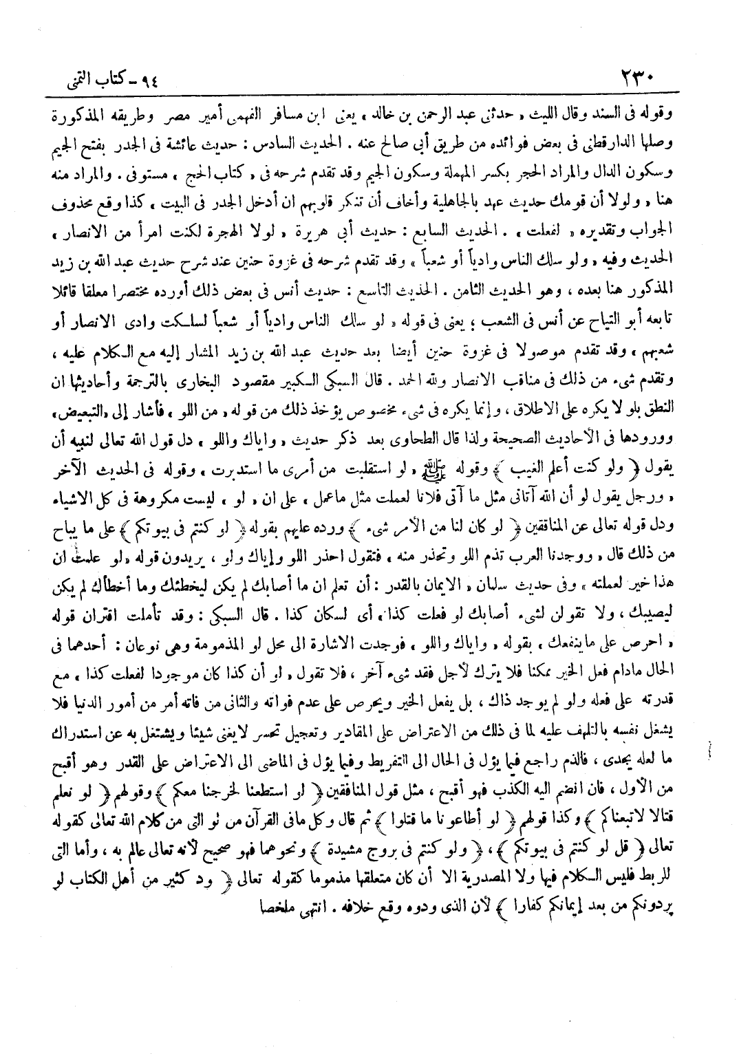 [7244] قَوْلِهِ لَوْ سَلَكَ النَّاسُ وَادِيًا أَوْ شِعْبًا لَسَلَكْتُ وَادِيَ الْأَنْصَارِ أَوْ شِعْبَهُمْ وَقَدْ تَقَدَّمَ مَوْصُولًا فِي غَزْوَةِ حُنَيْنٍ أَيْضًا بَعْدَ حَدِيثِ عَبْدِ اللَّهِ بْنِ زَيْدٍ الْمُشَارِ إِلَيْهِ مَعَ الْكَلَامِ عَلَيْهِ وَتَقَدَّمَ شَيْءٌ مِنْ ذَلِكَ فِي مَنَاقِبِ الْأَنْصَارِ وَلِلَّهِ الْحَمْدُ قَالَ السُّبْكِيُّ الْكَبِيرُ مَقْصُودُ الْبُخَارِيِّ بِالتَّرْجَمَةِ وَأَحَادِيثِهَا أَنَّ النُّطْقَ بِلَوْ لَا يُكْرَهُ عَلَى الْإِطْلَاقِ وَإِنَّمَا يُكْرَهُ فِي شَيْءٍ مَخْصُوصٍ يُؤْخَذُ ذَلِكَ مِنْ قَوْلِهِ مِنَ اللَّوْ فَأَشَارَ إِلَى التَّبْعِيضِ وَوُرُودُهَا فِي الْأَحَادِيثِ الصَّحِيحَةِ وَلِذَا قَالَ الطَّحَاوِيُّ بَعْدَ ذِكْرِ حَدِيثِ وَإِيَّاكَ وَاللَّوْ دَلَّ قَوْلُ اللَّهِ تَعَالَى لِنَبِيِّهِ أَنْ يَقُولَ وَلَوْ كُنْتُ أَعْلَمُ الْغَيْب وَقَوْلُهُ صَلَّى اللَّهُ عَلَيْهِ وَسَلَّمَ لَوِ اسْتَقْبَلْتُ مِنْ أَمْرِي مَا اسْتَدْبَرْتُ وَقَوْلُهُ فِي الْحَدِيثِ الْآخَرِ وَرَجُلٌ يَقُولُ لَوْ أَنَّ اللَّهَ آتَانِي مِثْلَ مَا آتَى فُلَانًا لَعَمِلْتُ مِثْلَ مَا عَمِلَ عَلَى أَنَّ لَوْ لَيْسَتْ مَكْرُوهَةً فِي كُلِّ الْأَشْيَاءِ وَدَلَّ قَوْلُهُ تَعَالَى عَنِ الْمُنَافِقِينَ لَو كَانَ لنا من الْأَمر شَيْء وَرَدَّهُ عَلَيْهِمْ بِقَوْلِهِ لَوْ كُنْتُمْ فِي بُيُوتِكُمْ عَلَى مَا يُبَاحُ مِنْ ذَلِكَ قَالَ وَوَجَدْنَا الْعَرَبَ تَذُمُّ اللَّوْ وَتُحَذِّرُ مِنْهُ فَتَقُولُ احْذَرِ اللَّوْ وَإِيَّاكَ وَلَوْ يُرِيدُونَ قَوْلَهُ لَوْ عَلِمْتُ أَنَّ هَذَا خَيْرٌ لَعَمِلْتُهُ وَفِي حَدِيثِ سَلْمَانَ الْإِيمَانُ بِالْقَدَرِ أَنْ تَعْلَمَ أَنَّ مَا أَصَابَكَ لَمْ يَكُنْ لِيُخْطِئَكَ وَمَا أَخْطَأَكَ لَمْ يَكُنْ لِيُصِيبَكَ وَلَا تَقُولَنَّ لِشَيْءٍ أَصَابَكَ لَوْ فَعَلْتُ كَذَا أَيْ لَكَانَ كَذَا قَالَ السُّبْكِيُّ وَقَدْ تَأَمَّلْتُ اقْتِرَانَ قَوْلِهِ احْرِصْ عَلَى مَا يَنْفَعُكَ بِقَوْلِهِ وَإِيَّاكَ وَاللَّوْ فَوَجَدْتُ الْإِشَارَةَ إِلَى مَحَلِّ لَوِ الْمَذْمُومَةِ وَهِيَ نَوْعَانِ أَحَدُهُمَا فِي الْحَالِ مَا دَامَ فِعْلُ الْخَيْرِ مُمْكِنًا فَلَا يُتْرَكُ لِأَجْلِ فَقْدِ شَيْءٍ آخَرَ فَلَا تَقُولُ لَوْ أَنَّ كَذَا كَانَ مَوْجُودًا لَفَعَلْتُ كَذَا مَعَ قُدْرَتِهِ عَلَى فِعْلِهِ وَلَوْ لَمْ يُوجَدْ ذَاكَ بَلْ يَفْعَلُ الْخَيْرَ وَيَحْرِصُ عَلَى عَدَمِ فَوَاتِهِ وَالثَّانِي مَنْ فَاتَهُ أَمْرٌ مِنْ أُمُورِ الدُّنْيَا فَلَا يَشْغَلْ نَفْسَهُ بِالتَّلَهُّفِ عَلَيْهِ لِمَا فِي ذَلِكَ مِنَ الِاعْتِرَاضِ عَلَى الْمَقَادِيرِ وَتَعْجِيلِ تَحَسُّرٍ لَا يُغْنِي شَيْئًا وَيَشْتَغِلُ بِهِ عَنِ اسْتِدْرَاكِ مَا لَعَلَّه يجدي فالذم رَاجع فِيمَا يؤل فِي الْحَال إِلَى التَّفْرِيط وَفِيمَا يؤل فِي الْمَاضِي إِلَى الِاعْتِرَاضِ عَلَى الْقَدْرِ وَهُوَ أَقْبَحُ مِنَ الْأَوَّلِ فَإِنِ انْضَمَّ إِلَيْهِ الْكَذِبُ فَهُوَ أَقْبَحُ مِثْلَ قَوْلِ الْمُنَافِقِينَ لَوِ اسْتَطَعْنَا لخرجنا مَعكُمْ وَقَوْلهمْ لَو نعلم قتالا لَا تبعناكم وَكَذَا قَوْلهم لَو أطاعونا مَا قتلوا ثُمَّ قَالَ وَكُلُّ مَا فِي الْقُرْآنِ مِنْ لَوِ الَّتِي مِنْ كَلَامِ اللَّهِ تَعَالَى كَقَوْلِهِ تَعَالَى قل لَو كُنْتُم فِي بُيُوتكُمْ وَلَو كُنْتُم فِي بروج مشيدة وَنَحْوِهِمَا فَهُوَ صَحِيحٌ لِأَنَّهُ تَعَالَى عَالِمٌ بِهِ وَأَمَّا الَّتِي لِلرَّبْطِ فَلَيْسَ الْكَلَامُ فِيهَا وَلَا الْمَصْدَرِيَّةُ إِلَّا إِنْ كَانَ مُتَعَلَّقُهَا مَذْمُومًا كَقَوْلِهِ تَعَالَى وَدَّ كَثِيرٌ مِنْ أَهْلِ الْكِتَابِ لَوْ يَرُدُّونَكُمْ من بعد ايمانكم كفَّارًا لِأَنَّ الَّذِي وَدُّوهُ وَقَعَ خِلَ