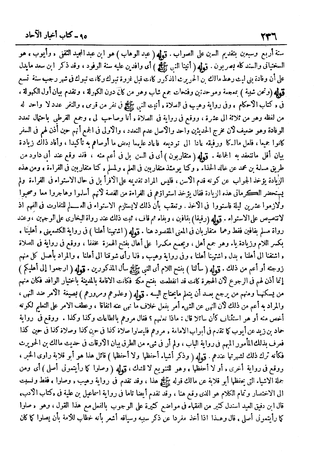 [7246] قَوْلُهُ عَبْدُ الْوَهَّاب هُوَ بن عَبْدِ الْمَجِيدِ الثَّقَفِيُّ وَأَيُّوبُ هُوَ السَّخْتِيَانِيُّ وَالسَّنَدُ كُلُّهُ بَصْرِيُّونَ قَوْلُهُ أَتَيْنَا النَّبِيَّ صَلَّى اللَّهُ عَلَيْهِ وَسَلَّمَ أَيْ وَافِدِينَ عَلَيْهِ سَنَةَ الْوُفُودِ وَقد ذكر بن سَعْدٍ مَا يَدُلُّ عَلَى أَنَّ وِفَادَةَ بَنِي لَيْثٍ رَهْطِ مَالِكِ بْنِ الْحُوَيْرِثِ الْمَذْكُورِ كَانَتْ قَبْلَ غَزْوَةِ تَبُوكَ وَكَانَتْ تَبُوكُ فِي شَهْرِ رَجَبٍ سَنَةَ تِسْعٍ قَوْلُهُ وَنَحْنُ شَبَبَةٌ بِمُعْجَمَةٍ وَمُوَحَّدَتَيْنِ وَفَتَحَاتٍ جَمْعُ شَابٍّ وَهُوَ مَنْ كَانَ دُونَ الْكُهُولَةِ وَتَقَدَّمَ بَيَانُ أَوَّلِ الْكُهُولَةِ فِي كِتَابِ الْأَحْكَامِ وَفِي رِوَايَةِ وُهَيْبٍ فِي الصَّلَاةِ أَتَيْتُ النَّبِيَّ صَلَّى اللَّهُ عَلَيْهِ وَسَلَّمَ فِي نَفَرٍ مِنَ قَوْمِي وَالنَّفَرُ عَدَدٌ لَا وَاحِدَ لَهُ مِنْ لَفْظِهِ وَهُوَ مِنْ ثَلَاثَةٍ إِلَى عَشَرَةٍ وَوَقَعَ فِي رِوَايَةٍ فِي الصَّلَاةِ أَنَا وَصَاحِبٌ لِي وَجَمَعَ الْقُرْطُبِيُّ بِاحْتِمَالِ تَعَدُّدِ الْوِفَادَةِ وَهُوَ ضَعِيفٌ لِأَنَّ مَخْرَجَ الْحَدِيثَيْنِ وَاحِدٌ وَالْأَصْلُ عَدَمُ التَّعَدُّدِ وَالْأَوْلَى فِي الْجَمْعِ أَنَّهُمْ حِينَ أَذِنَ لَهُمْ فِي السَّفَرِ كَانُوا جَمِيعًا فَلَعَلَّ مَالِكًا ورفيقه عادا إِلَى تَوْدِيعِهِ فَأَعَادَ عَلَيْهِمَا بَعْضَ مَا أَوْصَاهُمْ بِهِ تَأْكِيدًا وَأَفَادَ ذَلِكَ زِيَادَةُ بَيَانِ أَقَلِّ مَا تَنْعَقِدُ بِهِ الْجَمَاعَةُ قَوْلُهُ مُتَقَارِبُونَ أَيْ فِي السِّنِّ بَلْ فِي أَعَمَّ مِنْهُ فَقَدْ وَقَعَ عِنْدَ أَبِي دَاوُدَ مِنْ طَرِيقِ مَسْلَمَةَ بْنِ مُحَمَّدٍ عَنْ خَالِدٍ الْحَذَّاءِ وَكُنَّا يَوْمَئِذٍ مُتَقَارِبِينَ فِي الْعِلْمِ وَلِمُسْلِمٍ كُنَّا مُتَقَارِبِينَ فِي الْقِرَاءَةِ وَمِنْ هَذِهِ الزِّيَادَةِ يُؤْخَذُ الْجَوَابُ عَنْ كَوْنِهِ قَدَّمَ الْأَسَنَّ فَلَيْسَ الْمُرَادُ تَقْدِيمُهُ عَلَى الْأَقْرَأِ بَلْ فِي حَالِ الِاسْتِوَاءِ فِي الْقِرَاءَةِ وَلَمْ يَسْتَحْضِرِ الْكِرْمَانِيُّ هَذِهِ الزِّيَادَةَ فَقَالَ يُؤْخَذُ اسْتِوَاؤُهُمْ فِي الْقِرَاءَةِ مِنَ الْقِصَّةِ لِأَنَّهُمْ أَسْلَمُوا وَهَاجَرُوا مَعًا وَصَحِبُوا وَلَازَمُوا عِشْرِينَ لَيْلَةً فَاسْتَوَوْا فِي الْأَخْذِ وَتُعُقِّبَ بِأَنَّ ذَلِكَ لَا يَسْتَلْزِمُ الِاسْتِوَاءَ فِي الْعِلْمِ لِلتَّفَاوُتِ فِي الْفَهْمِ إِذْ لَا تَنْصِيصَ عَلَى الِاسْتِوَاءِ قَوْلُهُ رَقِيقًا بِقَافَيْنِ وَبِفَاءٍ ثُمَّ قَافٍ ثَبَتَ ذَلِكَ عِنْدَ رُوَاةِ الْبُخَارِيِّ عَلَى الْوَجْهَيْنِ وَعِنْدَ رُوَاةِ مُسْلِمٍ بِقَافَيْنِ فَقَطْ وَهُمَا مُتَقَارِبَانِ فِي الْمَعْنَى الْمَقْصُودِ هُنَا قَوْلُهُ اشْتَهَيْنَا أَهْلَنَا فِي رِوَايَةِ الْكُشْمِيهَنِيِّ أَهْلِينَا بِكَسْرِ اللَّامِ وَزِيَادَةِ يَاءٍ وَهُوَ جَمْعُ أَهْلٍ وَيُجْمَعُ مُكَسَّرًا عَلَى أَهَالٍ بِفَتْحِ الْهَمْزَةِ مُخَفَّفًا وَوَقَعَ فِي رِوَايَةٍ فِي الصَّلَاةِ اشْتَقْنَا إِلَى أَهْلِنَا بَدَلَ اشْتَهَيْنَا أَهْلَنَا وَفِي رِوَايَةِ وُهَيْبٍ فَلَمَّا رَأَى شَوْقَنَا إِلَى أَهْلِنَا وَالْمُرَادُ بِأَهْلِ كُلٍّ مِنْهُمْ زَوْجَتُهُ أَوْ أَعَمُّ مِنْ ذَلِكَ قَوْلُهُ سَأَلَنَا بِفَتْحِ اللَّامِ أَيِ النَّبِيُّ صَلَّى اللَّهُ عَلَيْهِ وَسَلَّمَ سَأَلَ الْمَذْكُورِينَ قَوْلُهُ ارْجِعُوا إِلَى أَهْلِيكُمْ إِنَّمَا أَذِنَ لَهُمْ فِي الرُّجُوعِ لِأَنَّ الْهِجْرَةَ كَانَتْ قَدِ انْقَطَعَتْ بِفَتْحِ مَكَّةَ فَكَانَتِ الْإِقَامَةُ بِالْمَدِينَةِ بِاخْتِيَارِ الْوَافِدِ فَكَانَ مِنْهُمْ مَنْ يَسْكُنُهَا وَمِنْهُمْ مَنْ يَرْجِعُ بَعْدَ أَنْ يتَعَلَّم مَا يحْتَاج إِلَيْه